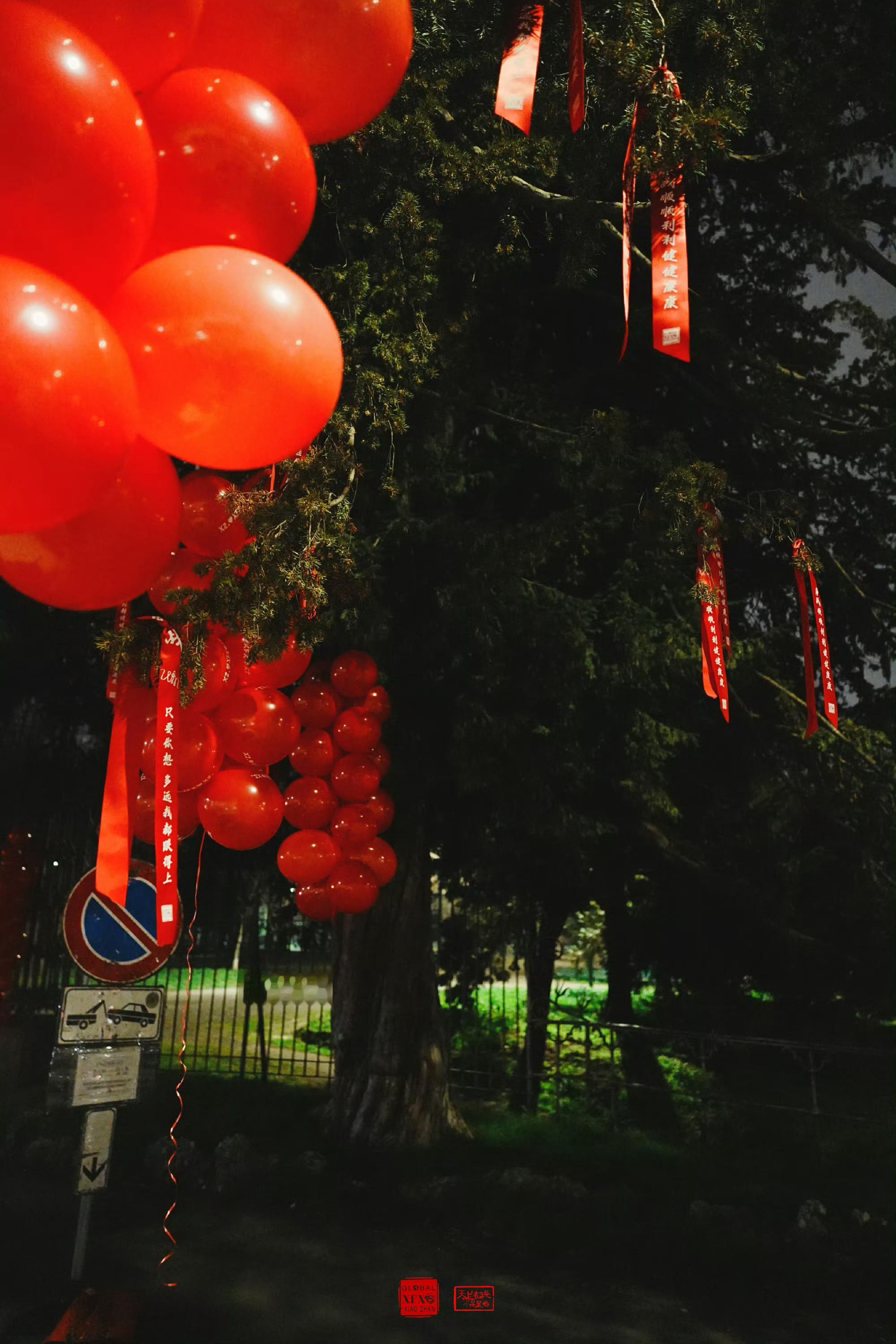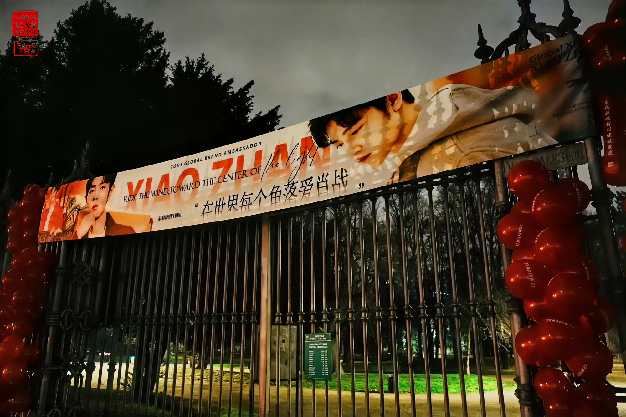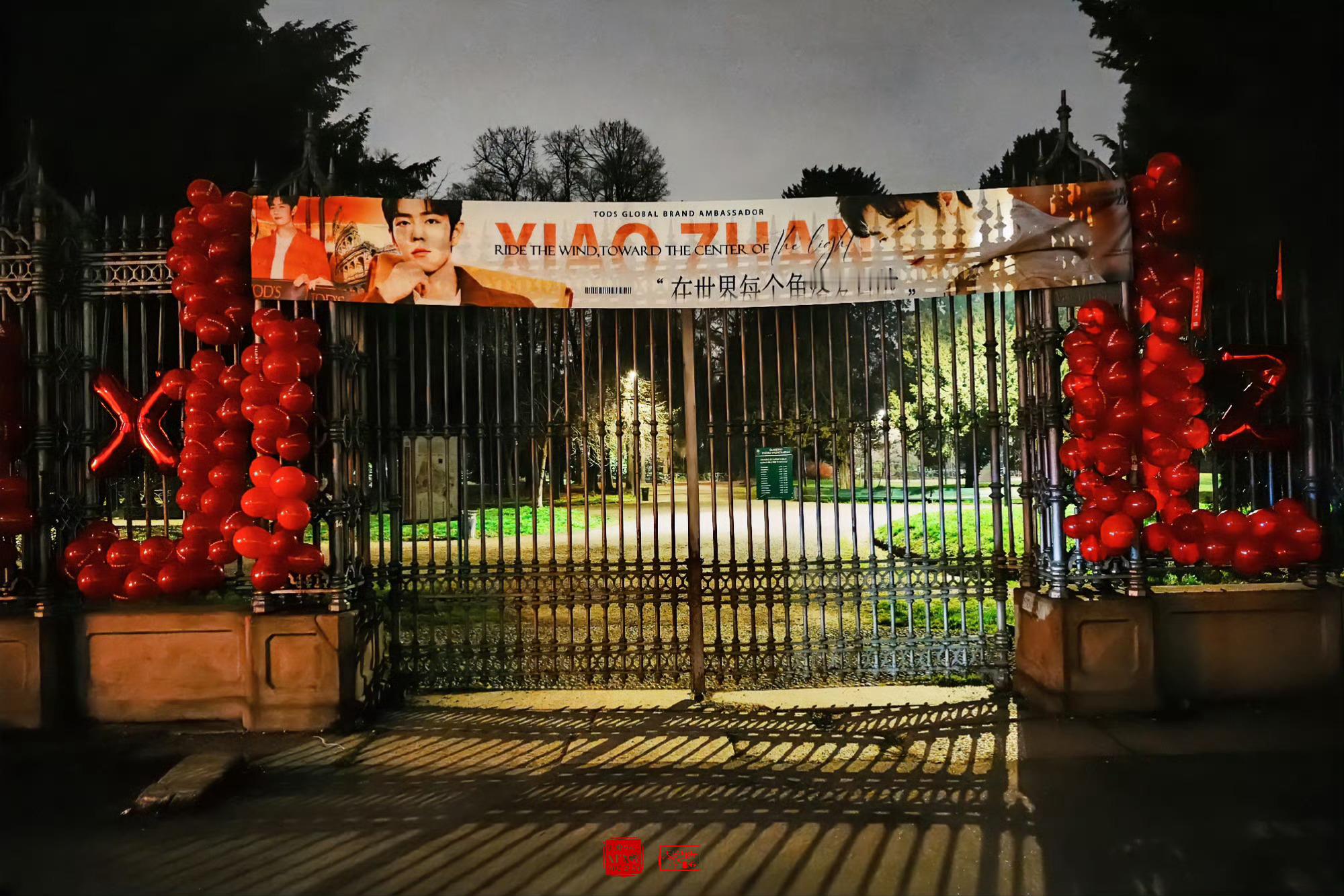 肖战米兰线下应援 肖战米兰线下应援🈶海外小飞侠夜拍,用红色气球、横幅和祝福组成