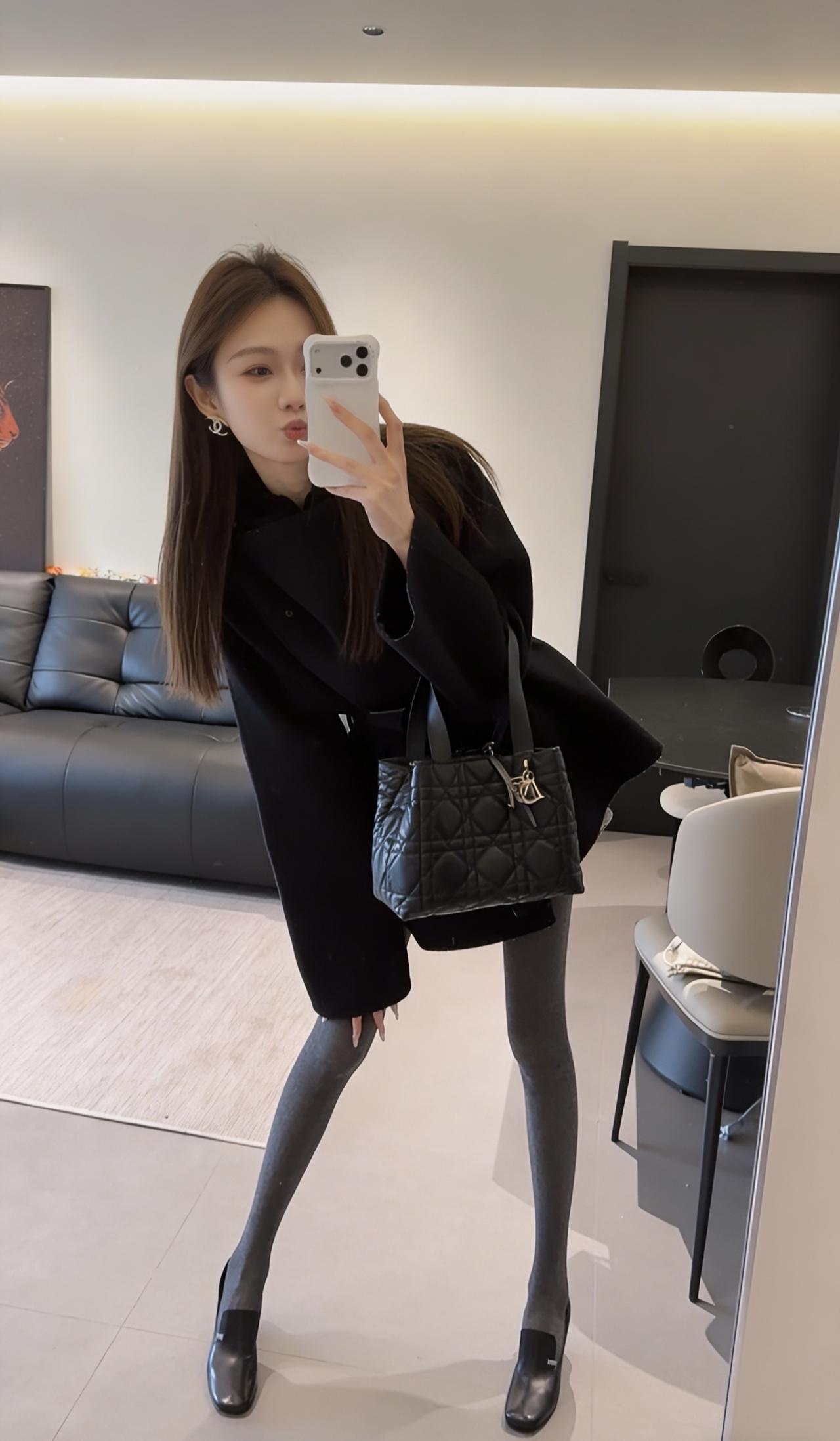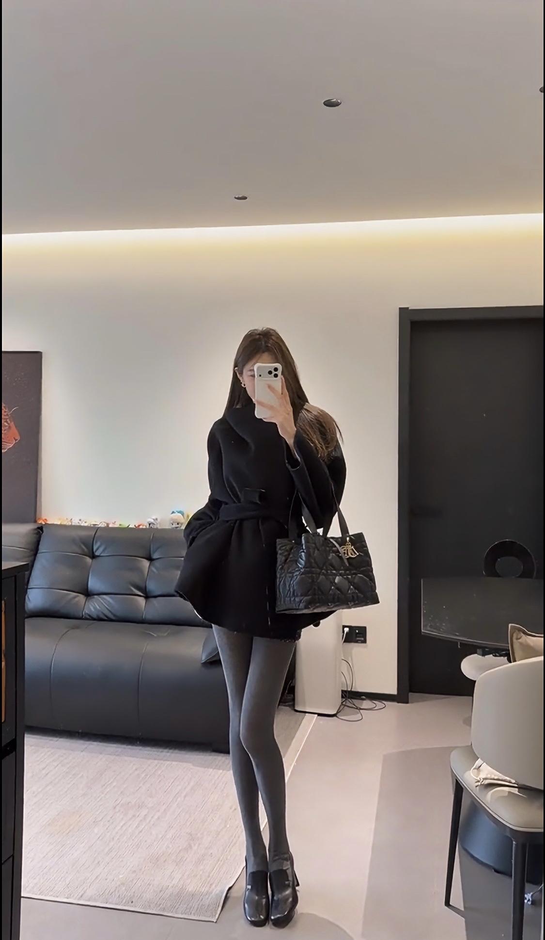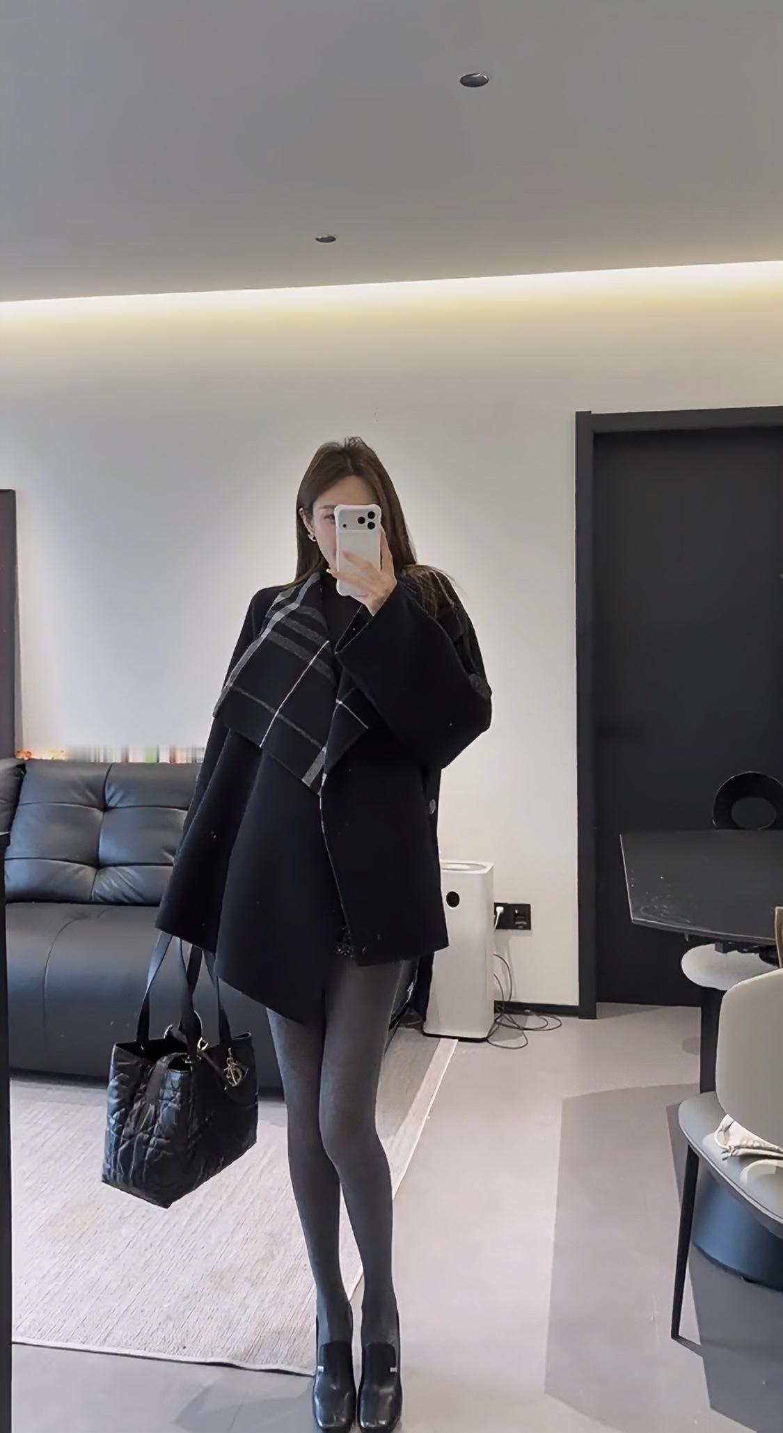 这套穿搭以黑色系为主,整体风格干练又不失温柔,细节丰富: • 外套:黑色收腰双面呢大衣,大翻领设计,搭配格纹披肩式围巾,既保暖又增加了层次感,收腰设计能很好地凸显身材比例。 • 内搭:黑色高领打底衫,简约又能提升整体的精致感。 • 下装:深灰色连裤袜,搭配黑色乐福鞋,既保暖又显得腿型纤细,风格统一。 • 配饰:黑色菱格纹托特包,金属扣饰提升质感,还有精致的耳饰作为点缀。 适合的场合: 1. 日常通勤:简约大气的黑色系穿搭,既专业又不失时尚感,非常适合办公室环境。 2. 朋友小聚/咖啡约会:整体风格温柔又有质感,拍照出片,适合和朋友轻松见面。 3. 秋冬逛街/探店:保暖性足够,又不会显得过于厚重,方便活动且造型感强。 4. 轻商务场合:如果需要参加一些非正式的商务会面,这套穿搭也能展现出专业又亲和的形象。 o o t d穿搭 今日穿搭 气质穿搭怎么穿才恰到好处?