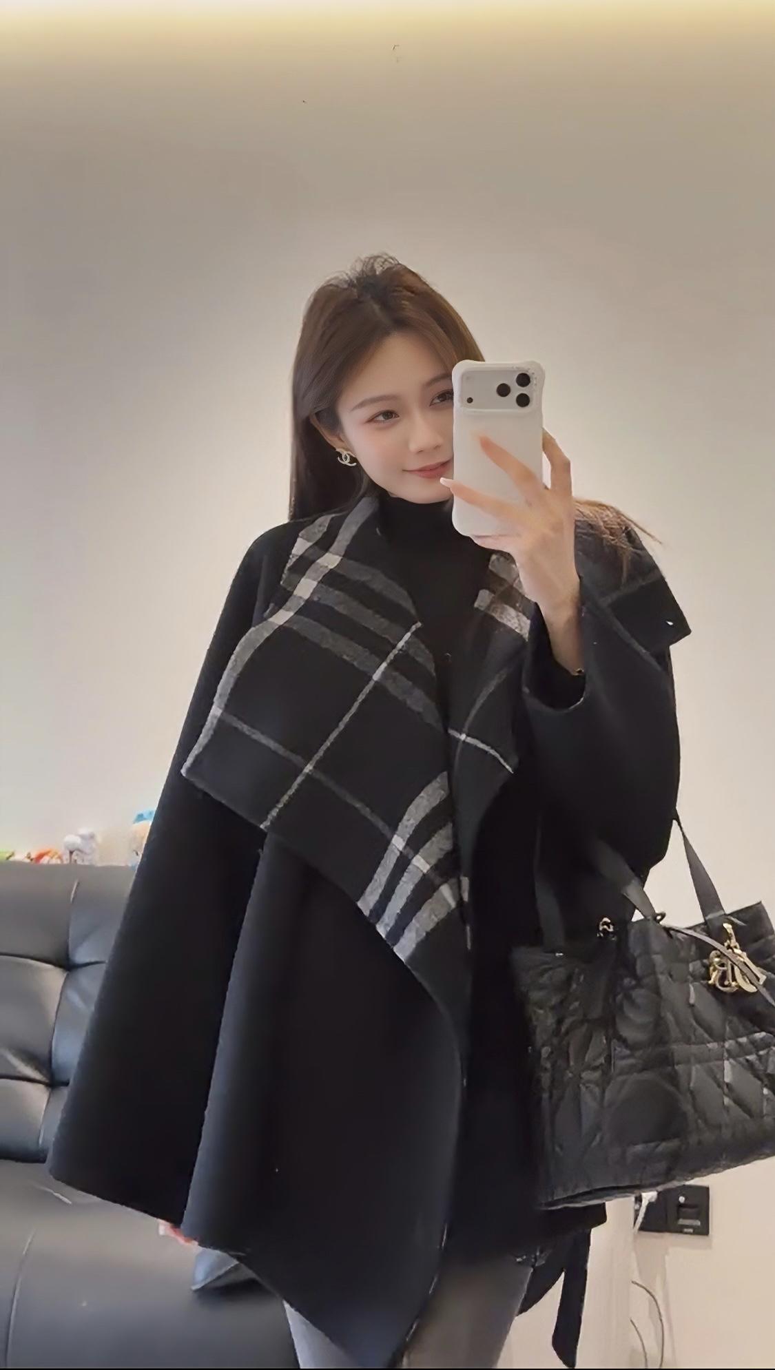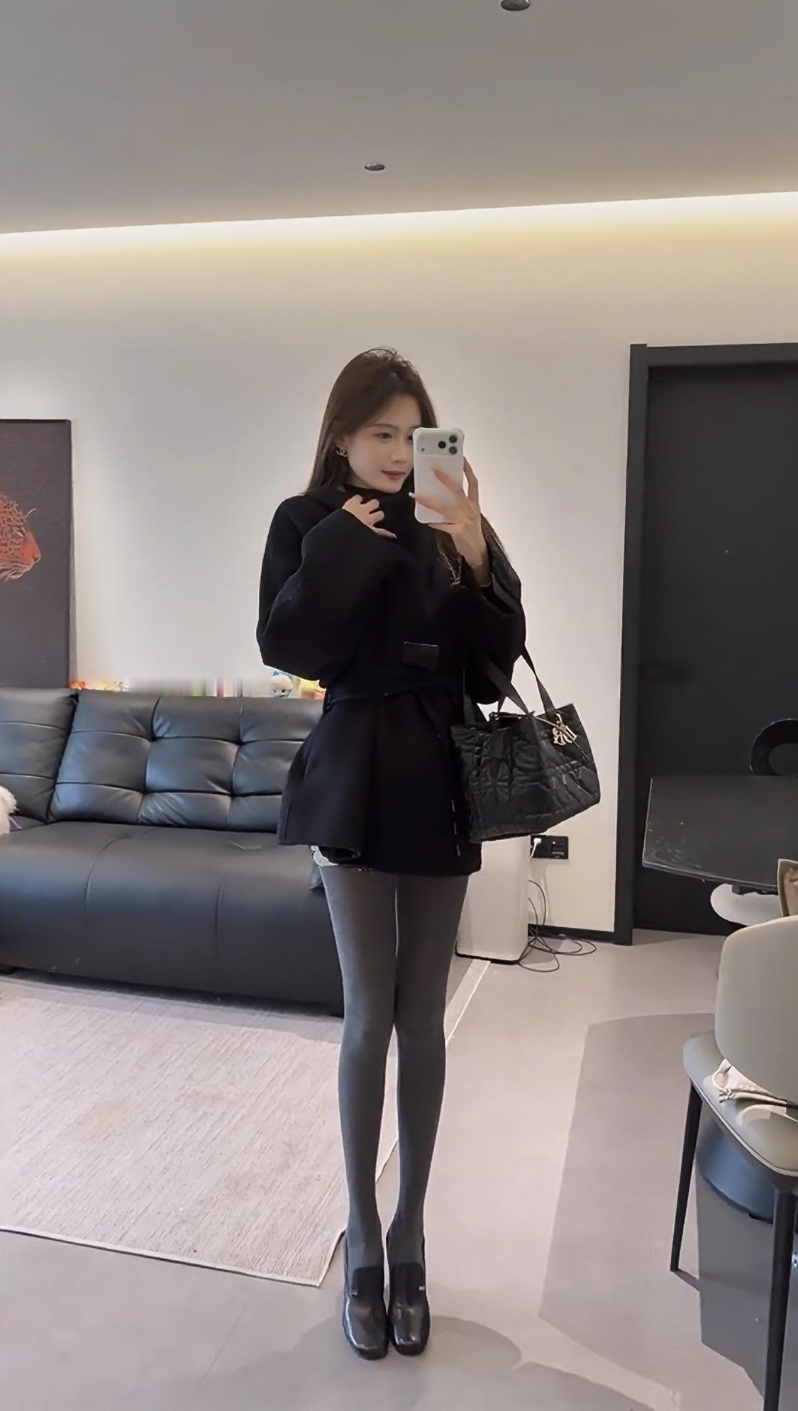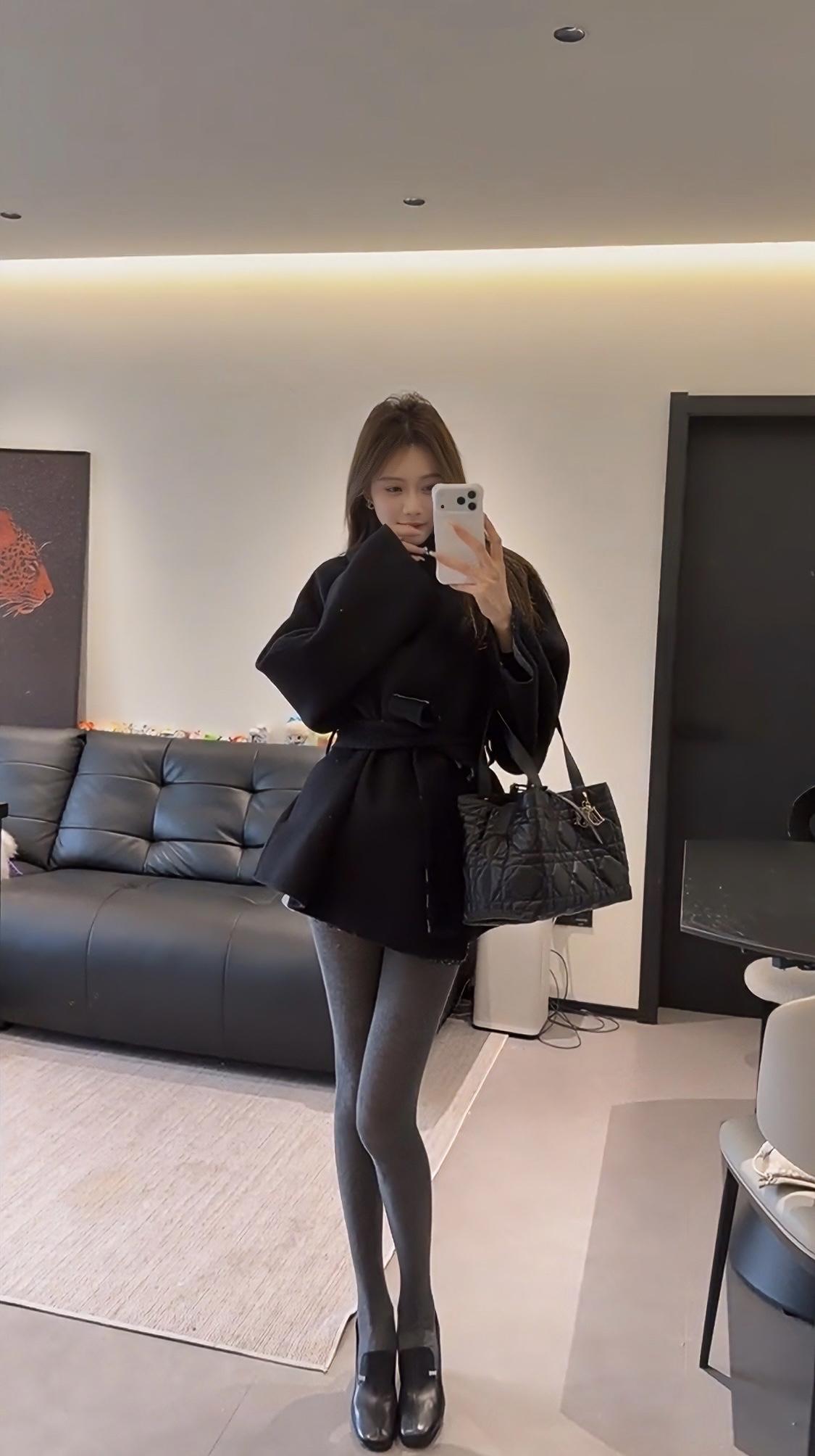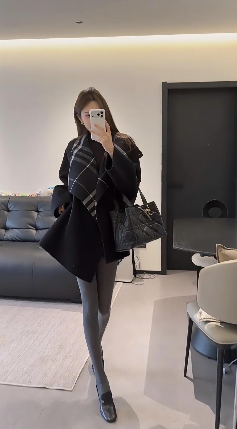 这套穿搭以黑色系为主,整体风格干练又不失温柔,细节丰富: • 外套:黑色收腰双面呢大衣,大翻领设计,搭配格纹披肩式围巾,既保暖又增加了层次感,收腰设计能很好地凸显身材比例。 • 内搭:黑色高领打底衫,简约又能提升整体的精致感。 • 下装:深灰色连裤袜,搭配黑色乐福鞋,既保暖又显得腿型纤细,风格统一。 • 配饰:黑色菱格纹托特包,金属扣饰提升质感,还有精致的耳饰作为点缀。 适合的场合: 1. 日常通勤:简约大气的黑色系穿搭,既专业又不失时尚感,非常适合办公室环境。 2. 朋友小聚/咖啡约会:整体风格温柔又有质感,拍照出片,适合和朋友轻松见面。 3. 秋冬逛街/探店:保暖性足够,又不会显得过于厚重,方便活动且造型感强。 4. 轻商务场合:如果需要参加一些非正式的商务会面,这套穿搭也能展现出专业又亲和的形象。 o o t d穿搭 今日穿搭 气质穿搭怎么穿才恰到好处?
