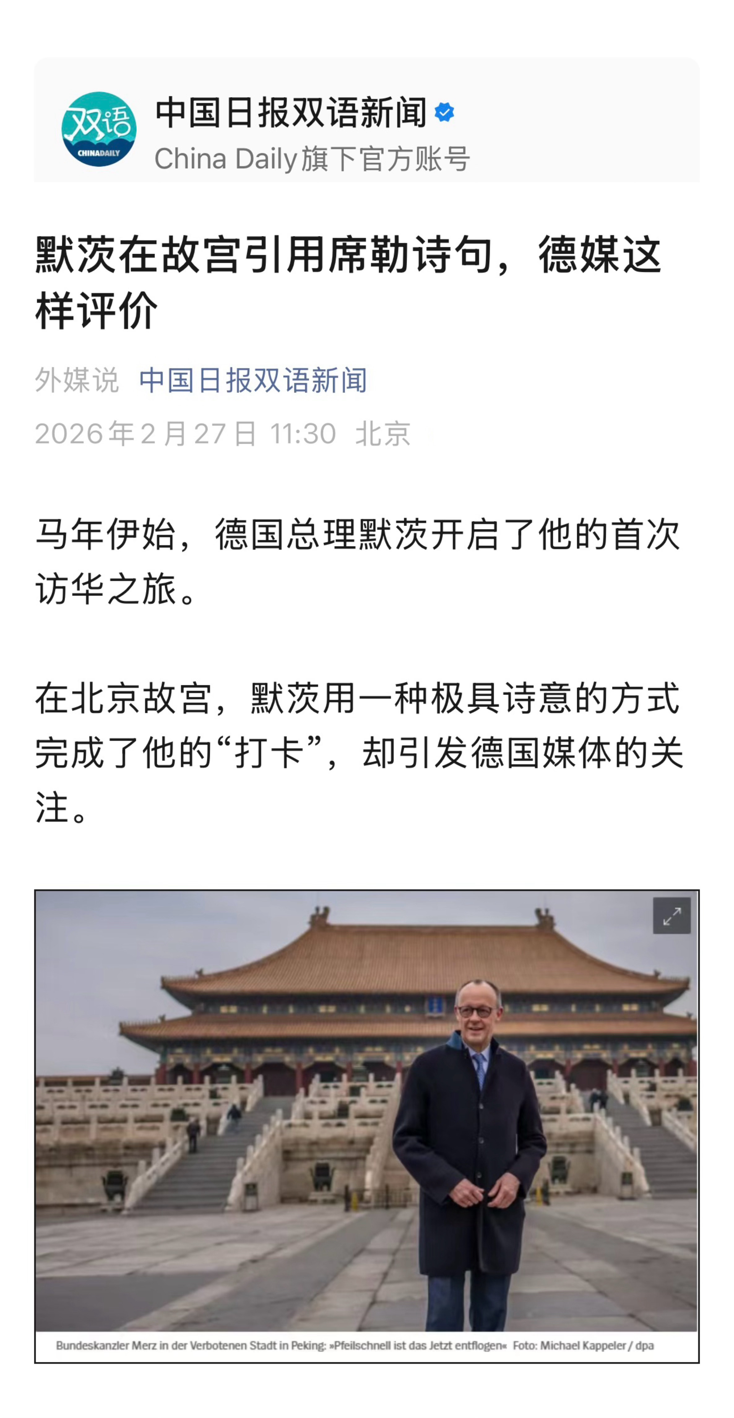 外媒说 【默茨在故宫引用席勒诗句,德媒这样评价】