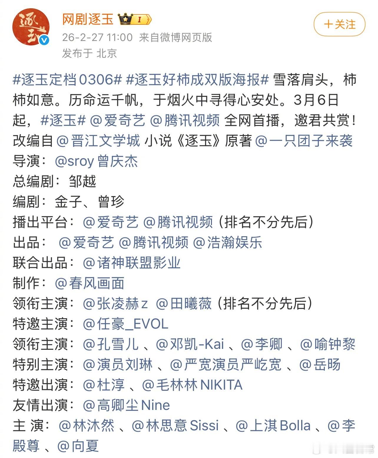 《逐玉》定档 领衔主演:张凌赫 田曦薇 (排名不分先后)逐玉定档