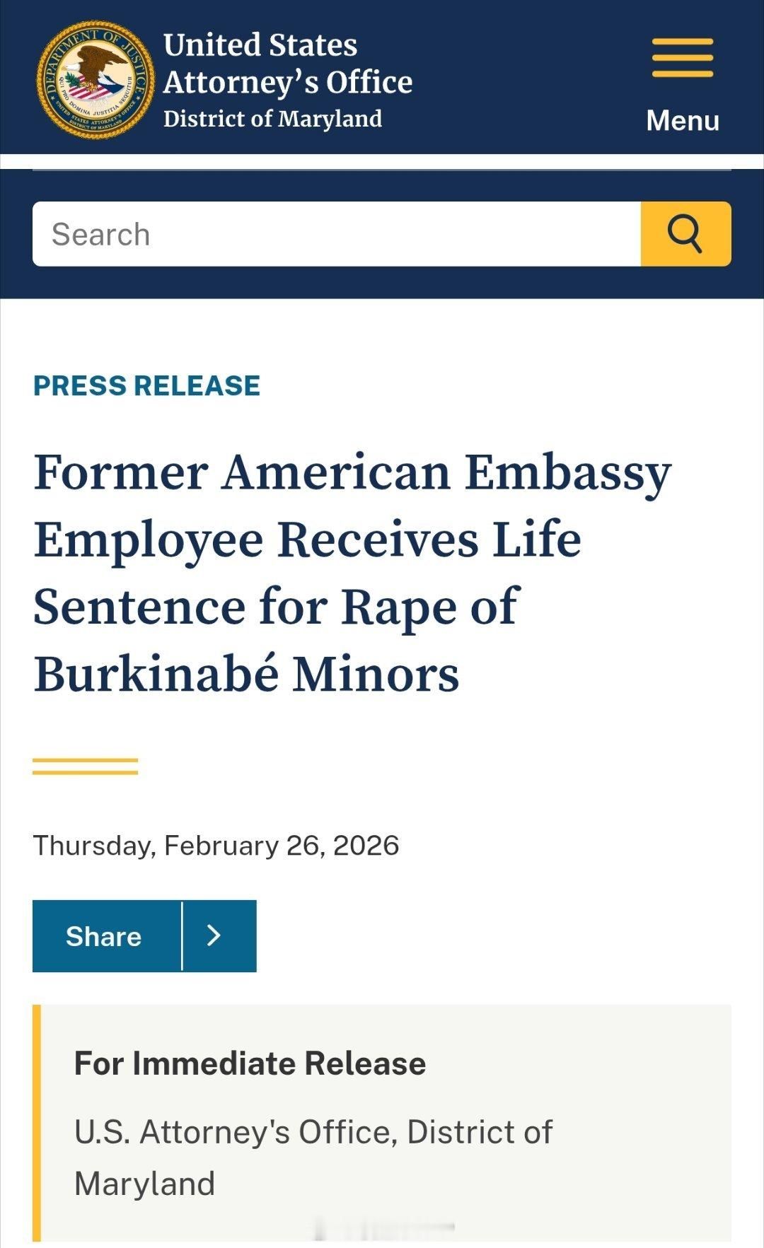 当地时间2月26日,美国马里兰州41岁男子福德·西塔法·马拉,因在2022至2023年间,于布基纳法索性侵两名未成年少女,被判处终身监禁。