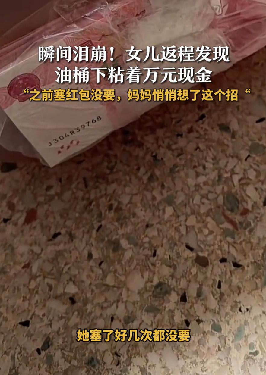 可怜天下父母心!江苏扬州,女子节后返程回家,收拾行李的时候,发现油桶下面好像垫着什么东西,拿起一看,竟然是10000块钱被胶布缠到了油桶上面,女子瞬间泪崩,她知道这是妈妈对她的爱 朱女士春节回老家过年,临走前,妈妈给她塞红包,可给了几次,全都被她拒绝了,她知道父母攒点钱不容易,自己也不急着用钱,所以就没有收 本以为拒绝几次,妈妈也就算了,傍晚到家后,她打开后备箱卸行李。年货堆得满满当当,腊肉、香肠、自家榨的菜籽油,都是母亲硬塞进来的。搬到最后,她发现油桶底下有点不对劲,好像垫着什么东西 伸手一摸,油桶被胶布粘住了?她用力一提,下面竟然露出一沓人民币,整整齐齐,用透明胶带牢牢缠在油桶底部 这一万块,得卖多少只鸡,种多少亩地。朱女士知道,这是母亲一整年甚至更久的积蓄。她掏出手机想打电话,又怕一开口就哭出声,最后只发了一条微信:妈,钱我看到了。过了很久,母亲回了一个笑脸,附了一句:别省着,该花就花 这样的事,看的让人感动。父母的爱,总是这样笨拙又执着。他们不懂什么转账扫码,只会把皱巴巴的现金藏在米袋里、塞进棉被角、粘在油桶底。他们不会说漂亮话,但每一个动作都在说,只要我还有,只要你要 很多人觉得父母那辈人抠门,舍不得吃舍不得穿。其实他们不是对自己抠,是把所有的慷慨都留给了孩子 父母在,人生尚有来处。他们给的钱,其实不是钱,是怕你饿着冻着的牵挂,是相隔千里的不放心,是这辈子无论你多大都还是孩子的认定。收下吧,别推辞了,因为那点钱,已经是他们能给你的全部了 女子返程发现妈妈在油桶下藏了1万块