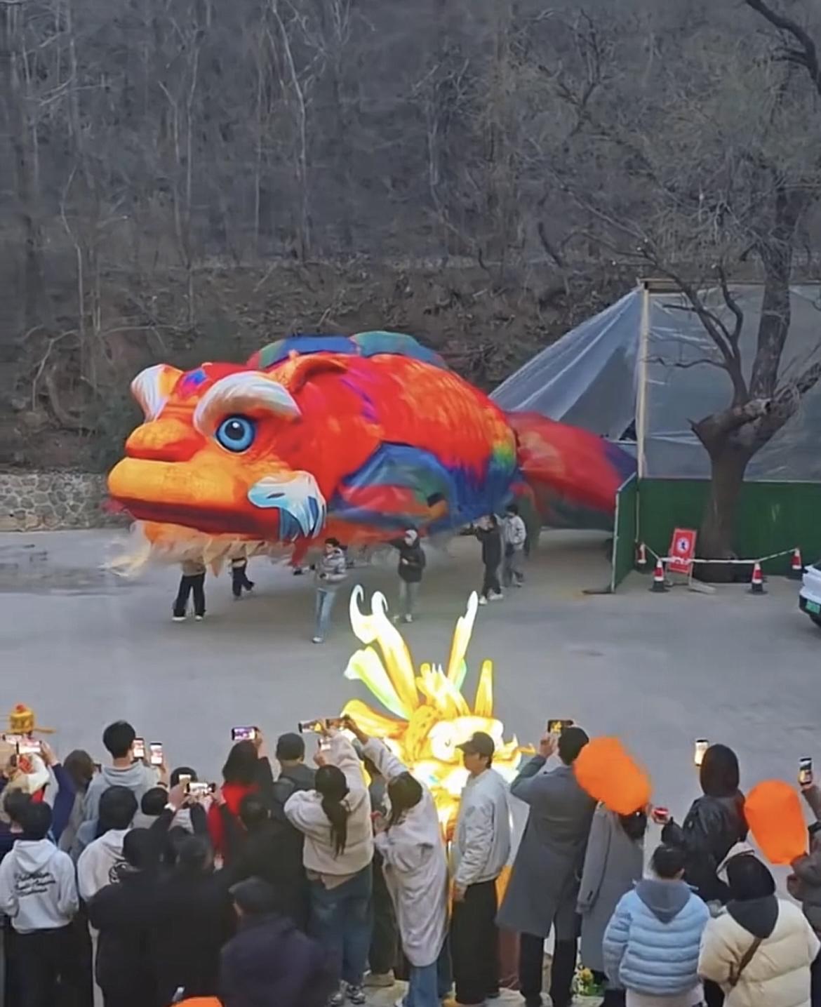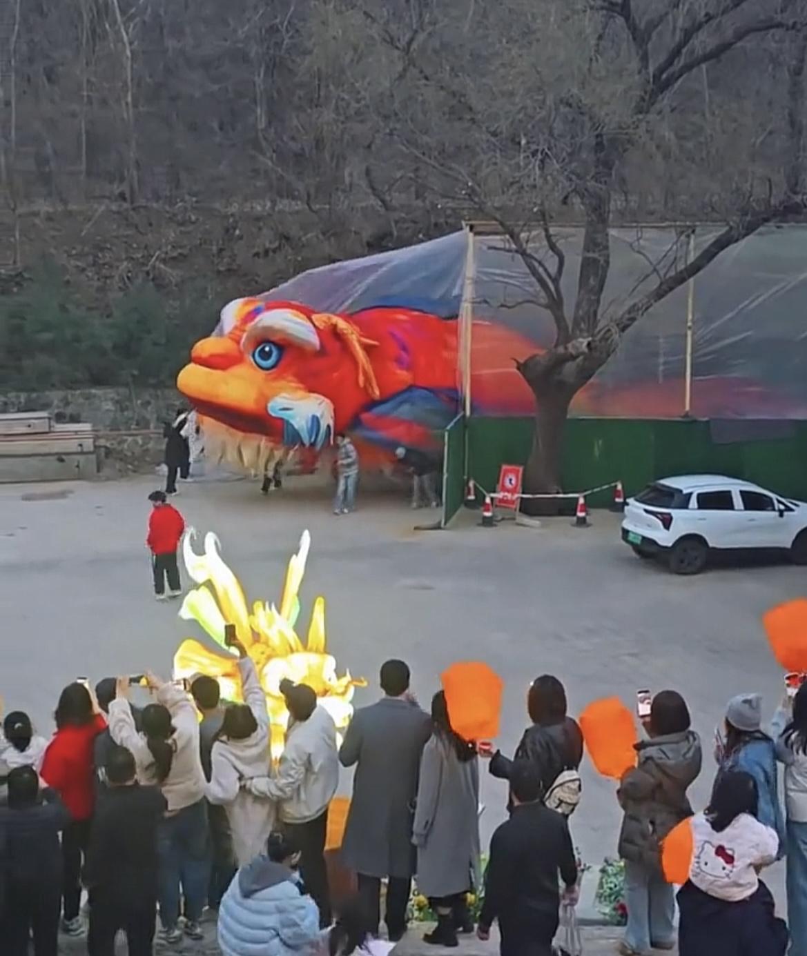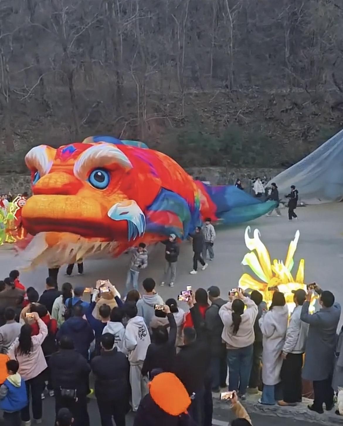 插翅难飞!山东淄博,红叶柿岩鳌鱼巡游,鳌鱼从“鳌宫”里被请出来,8个年轻小伙子紧紧拉住绳索,这是生怕这一只也飞走吧。 从画面看,景区是给鳌鱼专门做了一个棚子,用塑料膜罩住,用的时候,工作人员牵着绳,把鳌鱼从这个棚子里请出来。 鳌鱼出来的那一刻,现场观众纷纷举起手机,拍照留念,这只鳌鱼跟济南上新街飞走那只,是同一个厂家制作的同款产品,体型巨大,色彩鲜艳,眉毛胡须随风飘舞,真是气势恢弘。 有人不理解,不就是一个大气球嘛,怎么值几十万? 这个大气球可不简单,大头是气囊的材料,占到差不多一半的成本,用的都是高强度的PVC材料,抗老化,抗撕裂。 另外,这么大的空飘装置,里面需要有骨架,还要有配重系统、压力监测系统等,还需要做好密封,避免漏气。 还有外形设计、3D建模、风阻、浮力测试等,也需要一定的费用,大约占总成本10到15个百分点。 难怪景区这么谨慎,看看这8个小伙子,把手里的绳子攥得紧紧的,生怕一个不小心,再让这只鳌鱼也飞了。 不过,网友调侃,这只鳌鱼看眼睛,就比上新街那只老实,适合做打工鱼,而且,打工的地方是个漂亮的景区,红叶柿岩附近5公里左右,就有一座青龙山,这只鳌鱼离家也不远,应该不会再往外跑了。