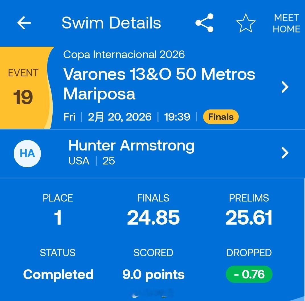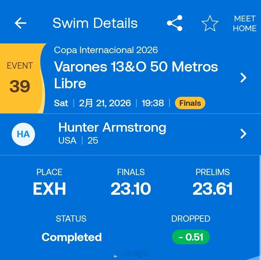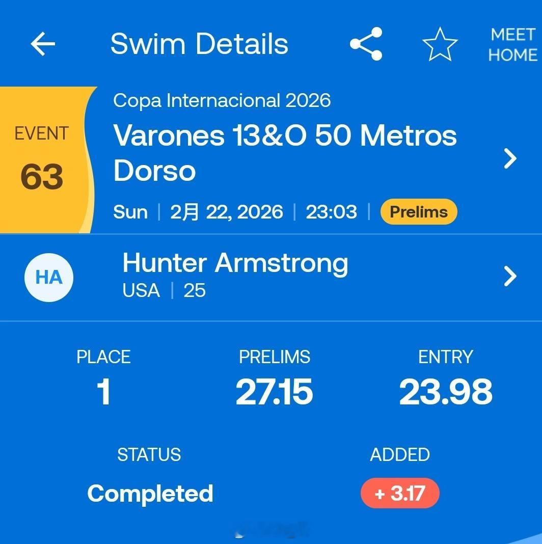 Hunter Armstrong50自:23.1050仰:27.15(预,决赛未比)50蝶:24.85