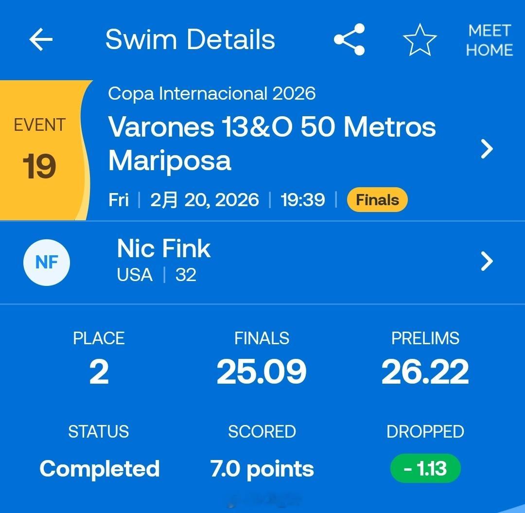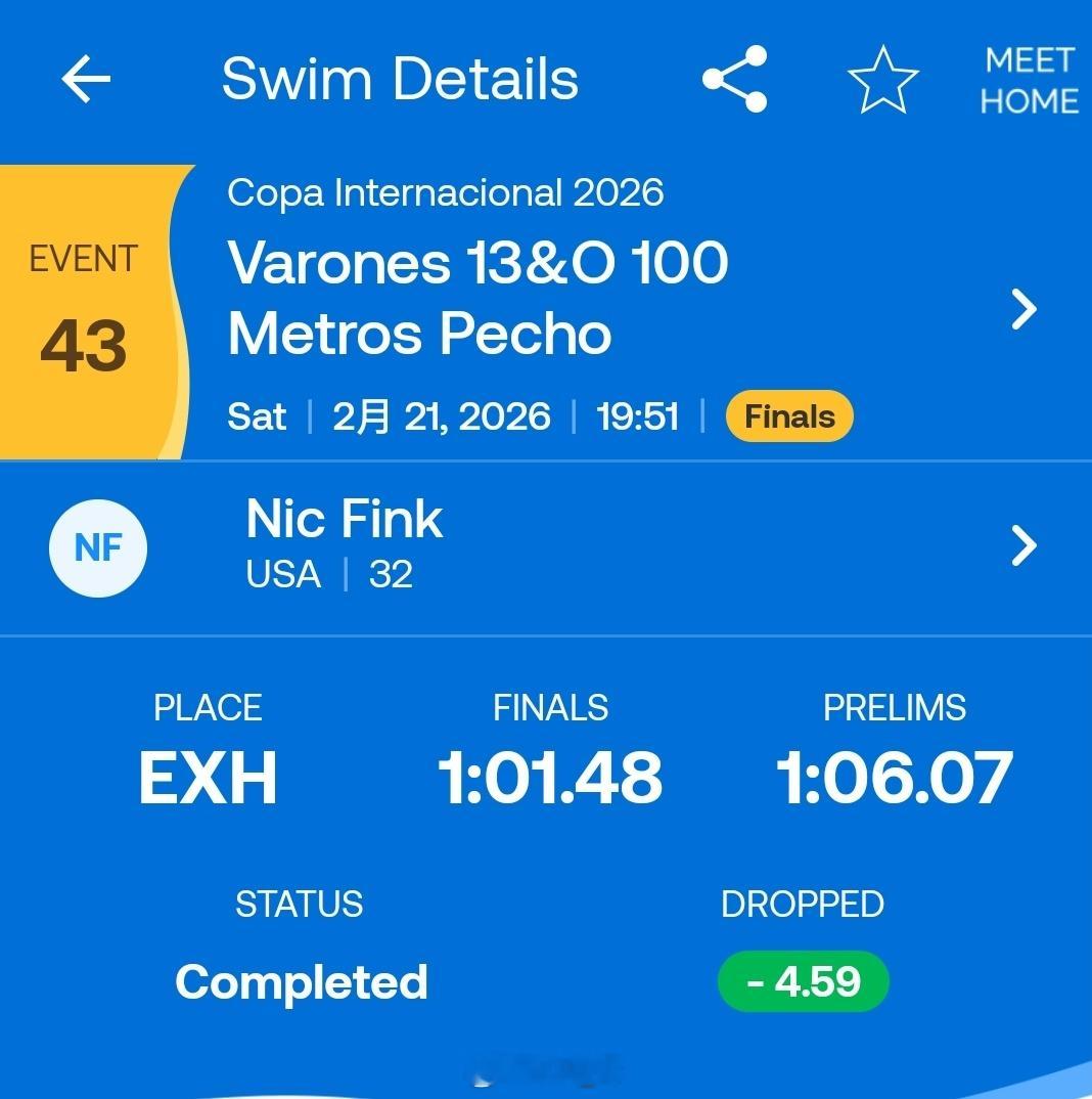 Nic Fink50蛙:29.79(预,决赛未比)100蛙:1:01.4850蝶:25.09
