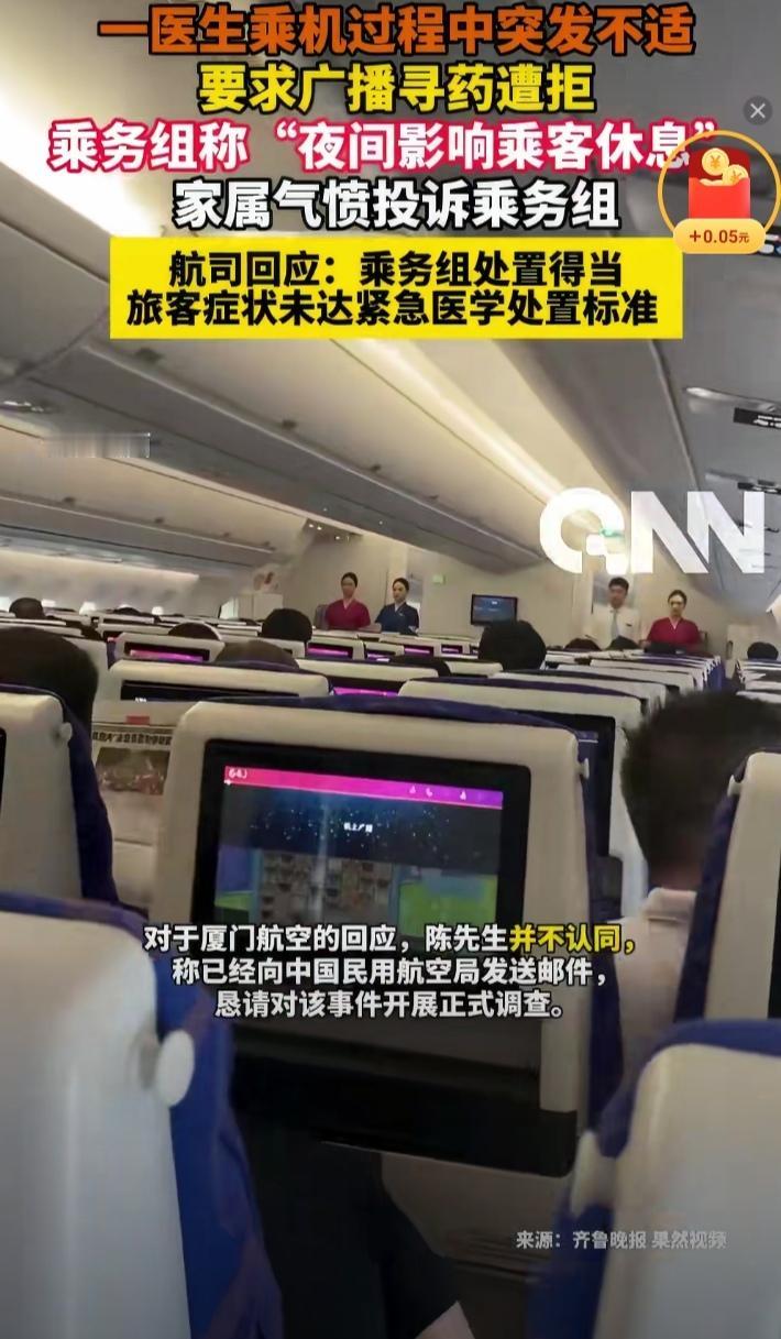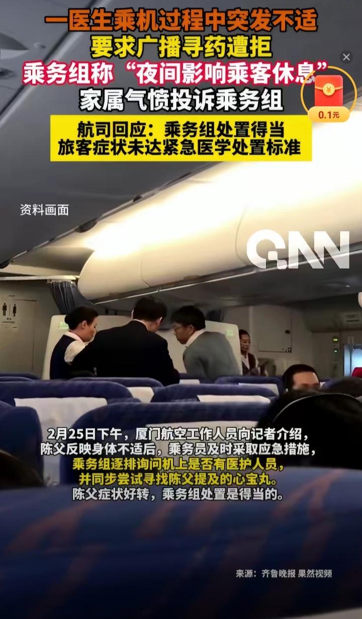 2月25日,陈先生乘坐厦门航空MF803次航班,飞往目的地墨尔本。 但飞行旅途中陈先生突感身体不适,随即找到乘务员希望能广播求药——心宝丸,但遭到工作人员的拒绝。理由是陈先生的病情不是很严重,还未达到必须启动应急医学预案的流程;二是当时已进入夜航状态,广播会打扰其他旅客的夜间休息。 虽然乘务员拒绝了陈先生的广播要求,但乘务组并未闲着,而是逐一询问机上乘客中是否有医护人员和心宝丸,并积极为陈先生提供暖水瓶、温糖水等,询问其是否需要吸氧设备,采取了除广播外的一系列应急措施。之后陈先生的病情缓解,顺利抵达了目的地。 尽管如此,陈先生及家属并不买账,认为乘务员置旅客的生命安全于不顾,已向中国民航发出邮件,要求对此事进行调查并作出解释。 对于此次事件,有网友认为乘务组对陈先生突发状况并未袖手旁观,完全按应急流程在做,没什么问题。反倒是质疑陈先生本是专业医生,明知自己的健康状态,却未随身配备相应的药物以备应急。 也有网友提出了自己的见解,认为乘客的安全高于一切,任何情况下都该为乘客的生命安全让路。 那么你认为,乘务组的做法是否合理合规,在乘客的生命和乘客的休息之间,谁重谁轻呢?