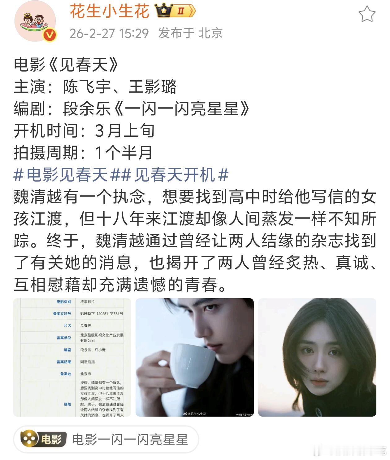 原来陈飞宇马上要进的组是电影啊,搭档王影璐《见春天》,3月上旬开拍