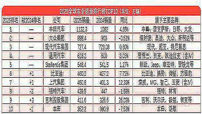 2025年全球汽车销量最终排名的尘埃落定!比亚迪汽车、上汽集团和吉利控股集团三家中国车企上榜。 从数据中我们可以直观地看到你所说的“差距”: 1.与榜首的差距:排名最高的比亚迪(460万辆)与榜首丰田(1132万辆)相比,销量差距超过 670万辆。这个数字甚至超过了2025年现代起亚之外的任何一家车企的总销量。 2.与前三的差距:比亚迪距离第三名的现代起亚(727万辆)也还有约 267万辆的差距,这几乎相当于要再卖出一个“吉利控股”的体量。 3.追兵在后:虽然中国车企进步神速,但排在前面的Stellantis、通用汽车等巨头,也在通过战略调整、聚焦优势市场等方式巩固自己的地位。 这份榜单既是里程碑,也是起跑线。对于中国车企来说,进入前十是第一步,如何在未来十年向前三乃至榜首发起真正的冲击,将是更精彩的篇章。 这三家上榜的中国车企里,你更看好哪一家的未来发展呢?