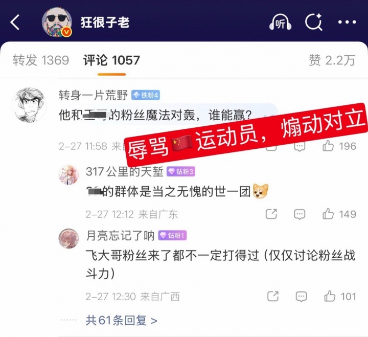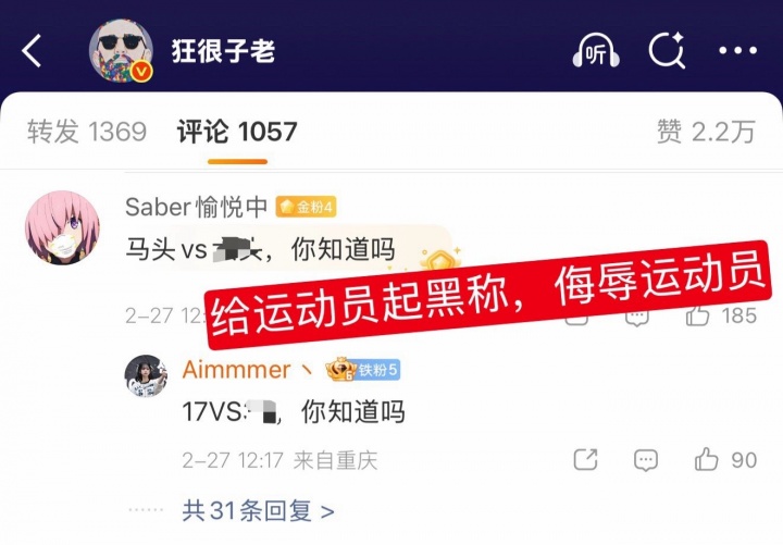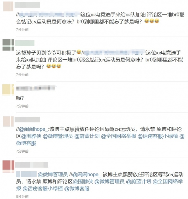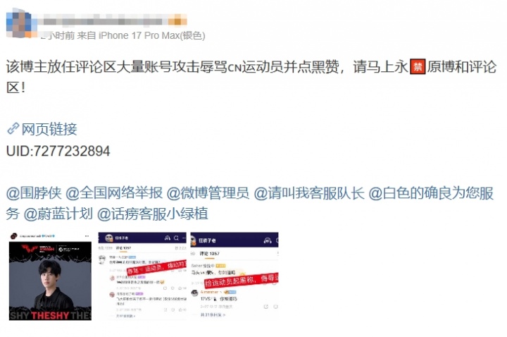 随后电竞博主“狂很子老”也发布该消息,但不久后评论区遭关闭,不少网友转发该条微博并评论称其点黑赞放任评论区辱骂CN运动员,要求官方永禁原博和评论区。
