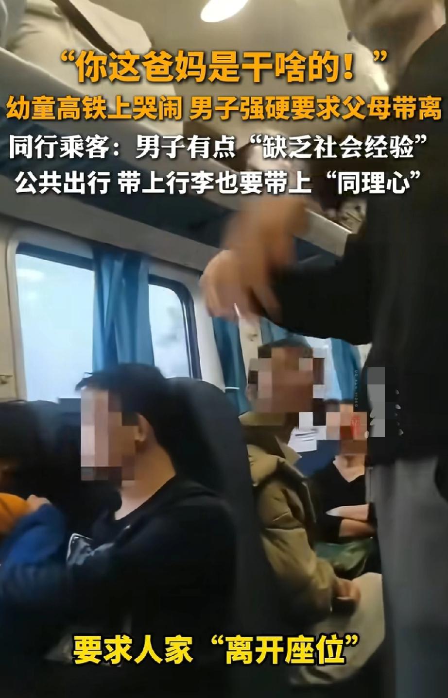 “你这爸妈是干啥的?” 2月25号在江西的一趟高铁上,一对年轻爸妈带着个一岁多的宝宝坐车,可能是耳压变化或者不舒服,娃一直哭,爸妈也没闲着,抱着哄、拍背、轻声安抚,全程都在管。 旁边坐着一男的,听着听着就炸了,“腾”一下站起来,指着那对爸妈就吼:“你这爸妈是干啥的!” 然后就要求人家“带孩子离开座位”,还说“带孩子就别坐高铁”“老子耳膜要炸了”。 爸妈说马上就挪到别的地方去,他也不依不饶,还多次喊乘警过来,质问人家怎么当父母的。 周围乘客都看不下去了,说这男的“缺乏社会经验”,孩子生理性哭闹不受控制,爸妈已经尽力在安抚了,他这么大喊大叫,比孩子哭声还吵人。 说实话,没小孩儿以前,也会觉得小孩吵,一直哭,也会觉得心烦,生了孩子以后就特别能理解了,孩子一旦哄不好,影响他人,心里也很会觉得自责,着急没办法,所以出门在外都不容易,大家也要多包容点儿! 父母高铁上带娃