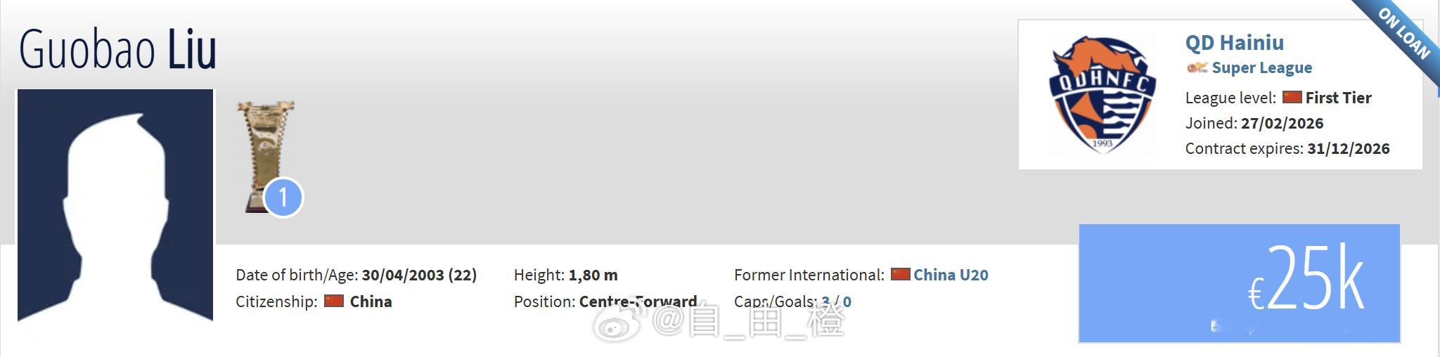 北京时间2月27日,据德转更新,刘国宝租借加盟青岛海牛,租借费约40万人民币。自