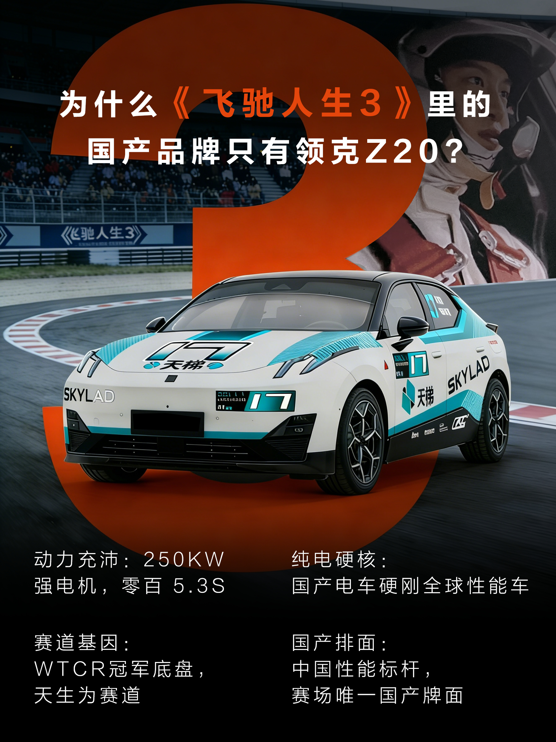终于懂了为什么《飞驰人生 3》国产独苗是领克 Z20!250KW 强电机、零百 5.3S 的爆发力,再加上 WTCR 冠军底盘的操控,实力碾压同级,成为赛场国产之光当之无愧! 领克 Z20飞驰人生 3范丞丞