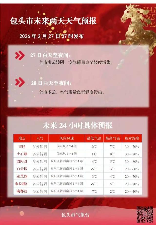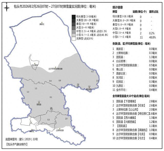 包头市气象局今日7时发布降水实况信息:2月26日07时至27日07时,我市出现降雪天气。最大降雪量出现在固阳县下湿壕镇为2.8毫米。