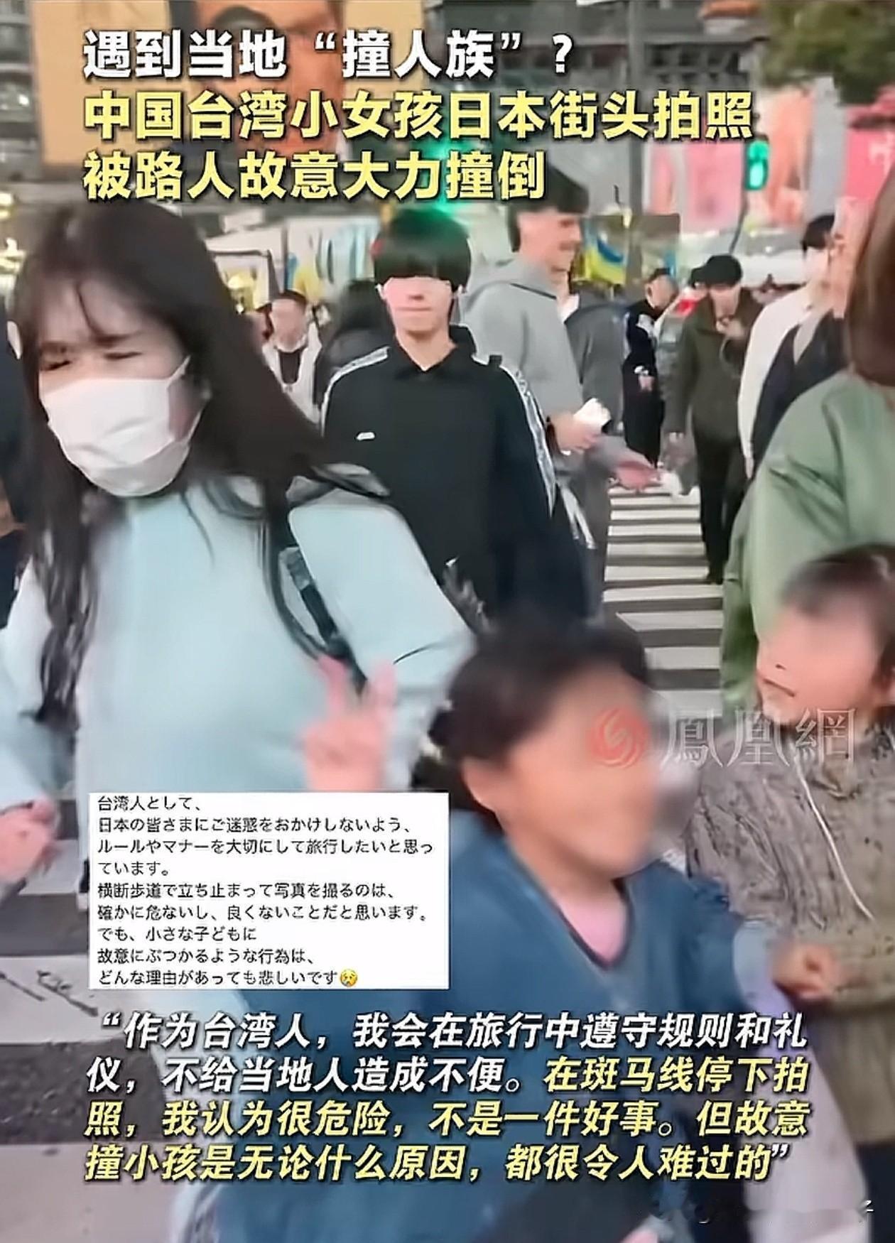 这种人啥心理啊!台湾一对母女到日本旅游,妈妈在街头给女儿拍照时,被一女子故意大力撞倒在地,吓得妈妈当场惊呼,但因在国外,人生地不熟的,也只能不了了之,于是妈妈将视频发到了网上! 有网友说,女子戴那么严实的口罩,撞的同时手肘还有往外用力的动作,一看就是存心使坏。 也有网友说,在斑马线上拍照,确实有点妨碍别人,双方都有责任。 还有网友说,刻在骨子的基因就是坏,这是永久不变的,所以要时刻警惕,把对他们的抵抗也要刻在骨子里。 大家怎么看呢?