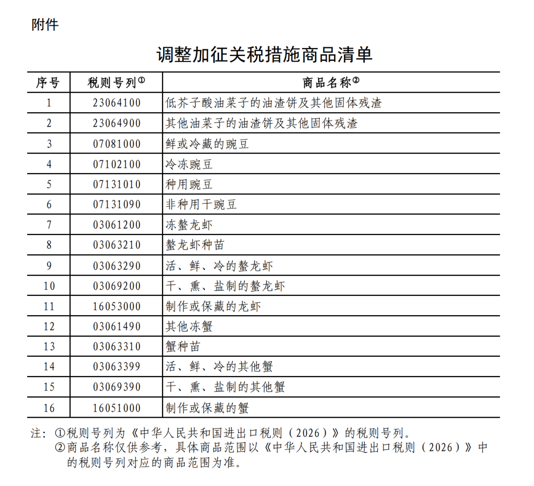 为落实中加两国领导人达成的重要共识,根据《中华人民共和国关税法》、《中华人民共和国海关法》、《中华人民共和国对外贸易法》等法律法规和国际法基本原则,自2026年3月1日至2026年12月31日,调整《国务院关税税则委员会关于对原产于加拿大的部分进口商品加征关税的公告》(税委会公告2025年第3号)规定的加征关税措施,不加征对原产于加拿大的油渣饼、豌豆加征的100%关税以及对原产于加拿大的龙虾、蟹加征的25%关税,具体商品范围见附件。
