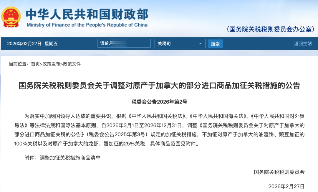 2月27日,国务院关税税则委员会发布关于调整对原产于加拿大的部分进口商品加征关税措施的公告。