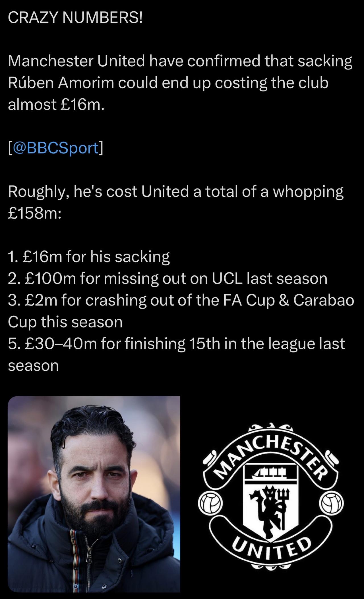 惊人个啥,腾哈格随便买个 圆规和马拉西亚,就接近这个数字了。 还不算这个哥们留下的其他一堆垃圾。 要不是腾光头🧑‍🦲留下这摊子,没办法执行战术的废物,曼联上个赛季能差成那样? 阿莫林唯一在成绩上,需要完全负全责的,只有欧联杯决赛这场。 ……………………………………………………………… 惊人的数字! 曼联方面已经确认,解雇鲁本·阿莫林最终可能会让俱乐部损失近 1600 万英镑。 [ @BBCSport ] 据估计,他总共花费了曼联高达 1.58 亿英镑: 1. 他因被解雇而获得1600万英镑的赔偿。 2. 因上赛季无缘欧冠冠军而被罚款1亿英镑 3. 因本赛季足总杯和联赛杯双双出局,罚款200万英镑 5. 上赛季联赛排名第15名,罚款3000万至4000万英镑
