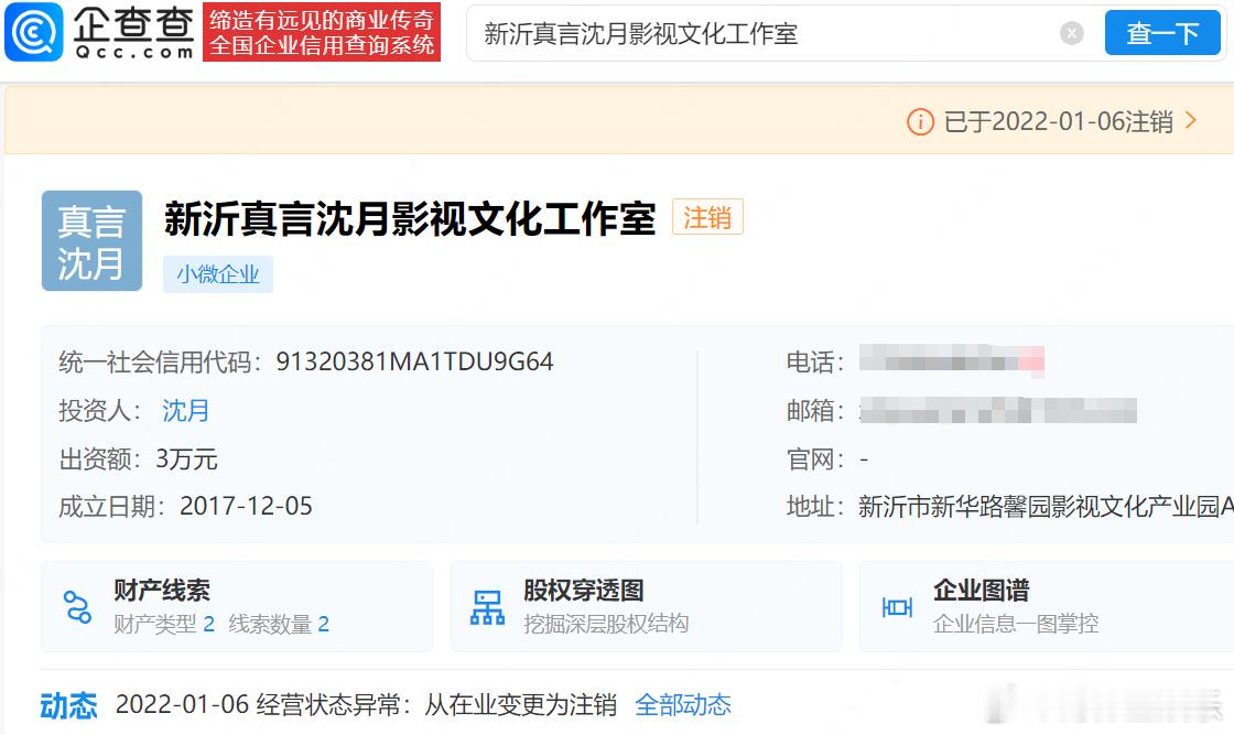 沈月名下一独资工作室已注销真言沈月工作室已注销近日,沈月工作室发长文为沈月送去29日生日祝福,因落款署名未带“工夫真言”前缀,引发热议。据企查查APP显示,新沂真言沈月影视文化工作室成立于2017年12月,出资额3万元,经营范围包含文艺创作与表演、组织文化艺术交流活动、影视制作服务等,为沈月个人独资企业,该工作室现已注销。沈月个人工作室