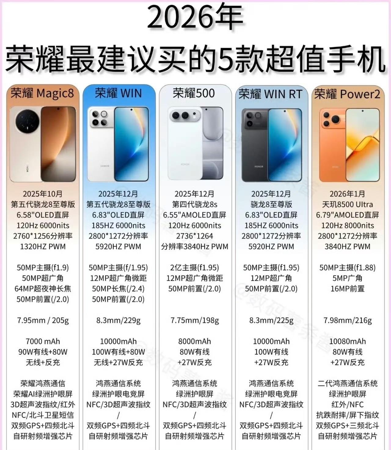 想换荣耀的朋友看过来!这五款才是目前最推荐购买的,基本可以闭眼入! 荣耀Magic8:高端全能旗舰,性能、影像、质感一步到位,商务党、颜值控都适合,用三五年都流畅。 荣耀WIN:电竞性能天花板,涡轮散热+满血芯,游戏满帧不发烫,重度玩家直接冲。 荣耀WIN RT:同价位真香王,10000mAh青海湖电池+强散热,续航与性能双在线,学生党首选。 荣耀500:2亿像素影像实力派,8000mAh大电池+骁龙8s旗舰芯,拍照好看、续航耐用,日常全能无短板。 荣耀Power2:户外续航怪兽,10080mAh巨电+满级防护,信号强、耐造抗摔,出差户外再也不用带充电宝。 五款覆盖了旗舰、游戏、影像、续航全场景所有需求,预算多少都能挑到合适的,今年换荣耀照着这5款选,准没错!!