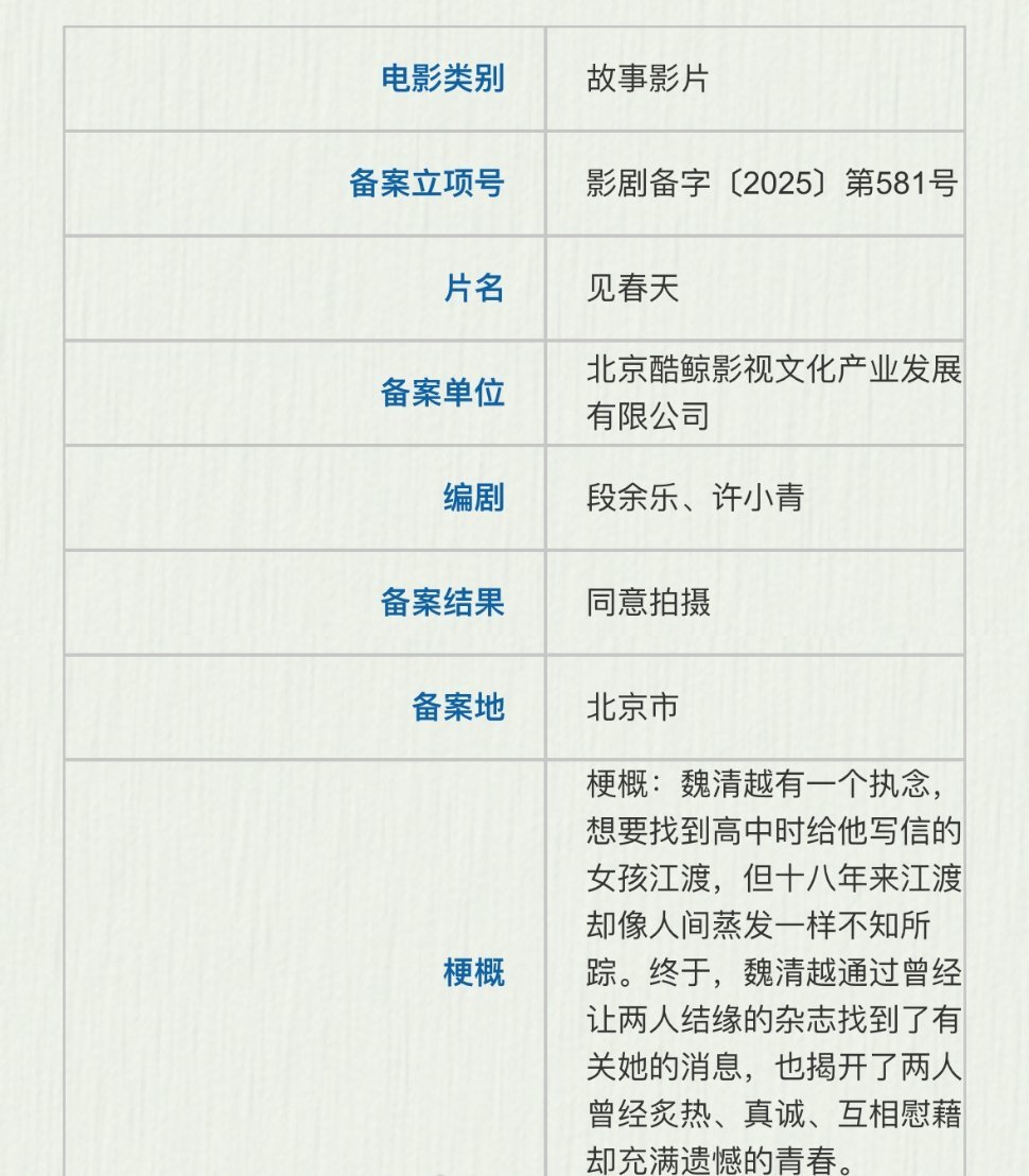电影《见春天》主演:陈飞宇、王影璐,3月上旬开机,拍摄周期1个半月