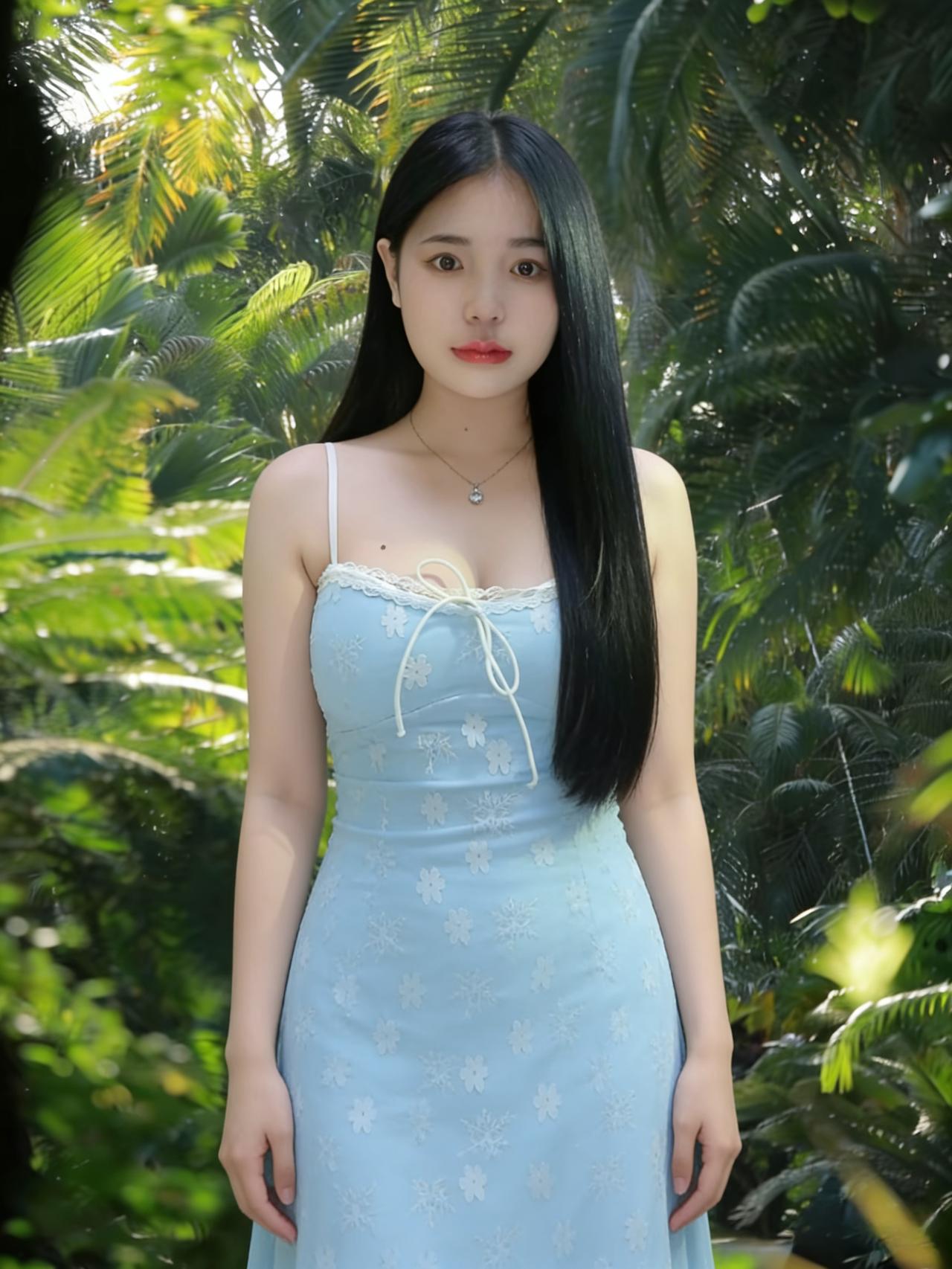 你从绿意深处走来, 像一汪清泉漫过青石苔。 蓝裙上的白花,是未融的雪, 是春信里,最先醒的蕊。 ~ 黑瀑垂落肩头, 每一缕都藏着风的低语。 颈间的银链轻晃, 像星子落进了温柔的湖。 ~ 棕榈叶在身后翻涌, 把日光揉成碎金, 落在你锁骨的痣上, 成了最隐秘的诗行。 ~ 你站在那里, 不说话, 就比整个夏天更安静, 比所有花开更动人。 ~ 风穿过叶隙, 拂过你裙角的褶皱, 像在临摹一幅画, 每一笔都轻得怕惊扰了梦。 ~ 你的眼波里, 盛着未名的湖与远山, 唇上的红, 是这青绿世界里, 唯一的火。