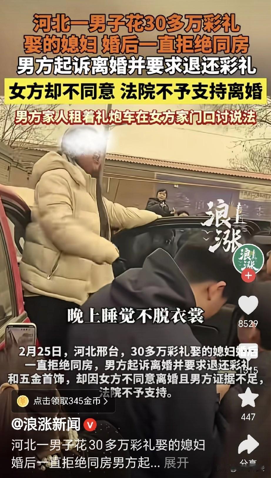 “太缺德了!”河北邢台,一男子结婚,花了30万彩礼,媳妇不愿意同房,和他分房而居,10个月后,男子起诉离婚,要求女方退彩礼和五金,可法院认为,男子证据不足,不支持离婚,男子租了个礼炮车开到女方家门口,男子家属大声吆喝: “她来俺家10个月了,晚上睡觉不脱衣服,内衣都不带换的!她不和你过,也不退钱,也不和你离!”网友: 她就是想拖时间,那样就能不退彩礼! 一男子到了结婚的年纪,父母着急,托了媒人给他介绍对象。 媒人立刻行动,很快就给他带来一位女子,女子秀丽,男子一眼就看上了女子。 俩人相识,感觉到了彼此满意,他们答谢了媒人,很快就将结婚提上了日程。 男子为了表达诚意,给女方支付了 257800 元的彩礼,又带女子到街上购物,给她买了五金首饰。 五金花了42800现金,这还不够,女子又想要个手机! 男子下了血本,拉着女子到手机店里,女子仔细挑选,选定了一款9400元的手机。 男子看女子高兴,他立刻刷卡将手机买下,在他心里,女子俨然就是他的妻子。 在男子心里,爱护妻子,天经地义,她想要天上的星星,男子也愿意给她摘取。 男子看着女子,满心满意都是爱惜,他掏心 掏 肺,恨不得立刻将女子娶进家门。 2024 年 2 月 9 日,俩人领了结婚证,婚事已成定局,男子家开始准备婚礼。 他们在家张灯结彩,门口贴上了大红喜字,他们向亲戚朋友们通知,他们就要举办婚礼。 婚礼选在了2 月 22 日,这是一个很好的日子,双方的婚礼如期举办,男方大摆宴宴,请了亲朋好友,还有满村的邻居。 女子的亲戚们也来贺喜,娘家人也坐在了酒席,他们端着酒杯,举杯庆贺,双方从这天起,正式成为了彼此的亲戚。 原本是喜气洋洋的一件事情,可没有想到,后面的发展完全失去了控制。 婚宴完毕,亲朋好友们陆续回去,男子和女子入了洞房,男子心里充满了爱意。 男子心想,从这天起,女子已经正式成为了他的妻子,他想休息,他想圆房,他想和女子做一对真正的夫妻。 可万万没有想到,女子正襟危坐,根本就不搭理男子,男子以为她害羞,因此耐心的等待女子。 到了很晚的时候,女子还不脱衣服,她合衣躺下,和男子保持着距离。 男子不知何故,以为女子还没做好准备,他开始并没理会,可不久之后,他就发现了问题。 女子不肯和他同房,甚至搬到了别的屋里,唯恐和男子发生夫妻的关系。 男子越想越气,转眼就是10个月过去,这种事说不出口,男子白花了30万的彩礼。 他明明娶了个大活人回家,但是只能看不能碰,让他心急如焚,关键的是,他搞不明白,女方到底是啥意思? 你既然看不上我,当初为啥同意婚事?你不能接了彩礼,举办了婚礼,来到我家,当了个花瓶? 我既不敢碰,也不敢动,你啥意思,过不下去你说一声?你不能这样耽搁别人! 可女子不理,她没有过不下去,她觉得这样挺好,她啥都有,也和男子完成了婚礼,已经做了男子名义上的妻子。 男子不愿意了,他跑到法院上诉离婚,要求女方退还彩礼和五金。 可女子拒绝,说他们感情并没有破裂,她不离婚,也不愿意退还彩礼。 《民法典》第1079条规定:夫妻一方要求离婚,法院应先调解;感情确已破裂、调解无效,应准予离婚;一方不同意且无重婚、家暴、分居满二年等法定情形,法院可判不离。 因此,法院以男子证据不足,女方不同意离婚,不支持离婚。 男子急了,父母还急着要抱孙子,你不能不和我过,也不和我离婚! 谁家的钱都是钱,30万元可不是个小数,男子家越想越气,总不能就这样耽搁下去。 在他们心里,你既然不过,就不要占着位置,男子要过正常的日子。 他之所以结婚,就是要过夫妻生活,他要生几个孩子,传宗接代,为他们的家里再添人丁。 可是因为女子,男子的愿望全部落空,钱也没了,人也没了,空空挂着已婚的名声。 即便他要娶,也得先离婚才行,可女子不肯退还彩礼,她口口声声说还有感情。 男子家被耗尽了耐心,他们租了一辆礼炮车,轰轰隆隆开到了女方家门口。 看热闹的村民围成了一片,男子家属站在车上,大声的吆喝: “她来我家10个月了,她睡觉不脱衣服,内衣都不带换的,我家垃圾桶还绑着大红花!” 男子家属心里难过: 她也不过,她也不离,她也不退彩礼! 有人认为,女方收了彩礼,婚后10个月拒不履行夫妻生活义务,也不同意退彩礼,其行为等同于骗婚! 也有人说,这女的是在拖时间,时间一长就不用退彩礼。 更有人说,结婚不同房,离婚退彩礼又不行,这是要把人逼上绝路啊! 目前,相关部门已经介入调解。 对此,你怎么看?