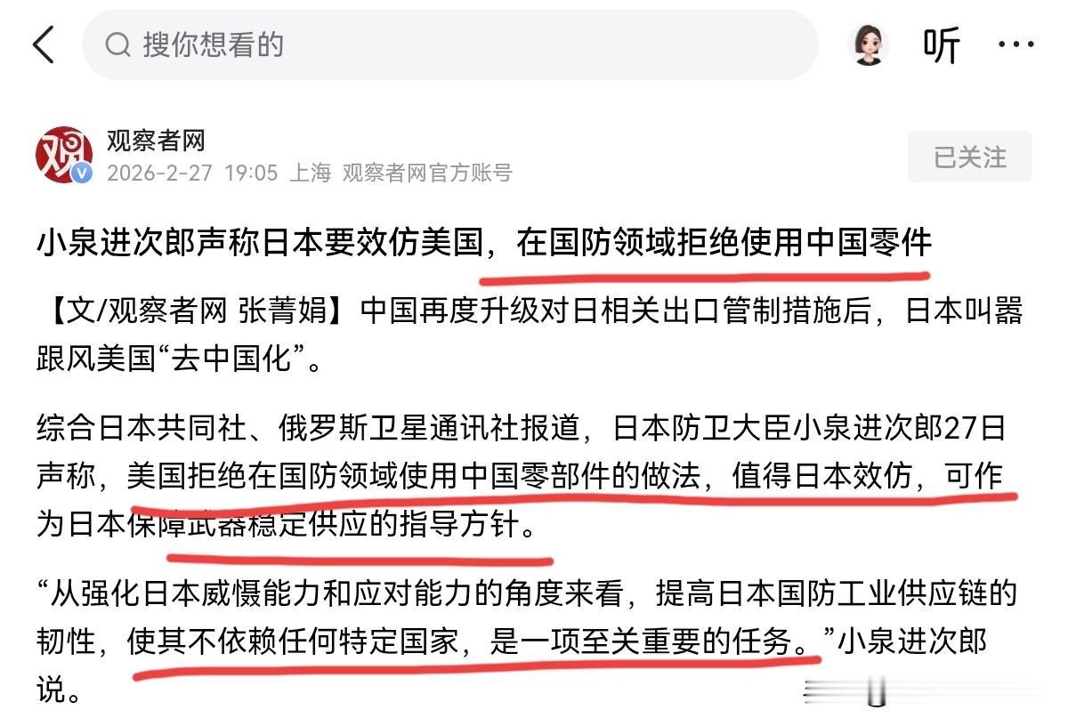 不会在中国的压力下低头!日本防卫大臣小泉进次郎出来回应了!2月27日,在我们再度升级对日相关出口管制措施后,日本防卫大臣小泉进次郎表示,从强化日本威慑能力和应对能力的角度来看,提高日本国防工业供应链的韧性,使其不依赖任何特定国家,是一项至关重要的任务。 例如在部分零部件上不使用中国产品,尽可能实现自主。这种做法,可以作为确保武器稳定供应的指导方针。为实现这一目标,日本将推动供应链多元化与技术自主,加强与盟友和伙伴的合作,以提高国防自主能力。很显然,面对我们的升级管制举措,小泉进次郎的表态,传递的意思很清楚,那就是日本不仅不会低头,而且还要通过“去中国化”,实现独立自主。 更深层次的,这说明什么呢?这说明即便日本现在正在付出代价,但是日本军国主义化的目标并不会改变。日本宁可自断产业链、承受经济阵痛,也要加速扩军备战。当然,小泉进次郎嘴巴讲话很硬,但是日本能不能彻底摆脱对中国关键原材料的依赖,这就是另外一个问题了。有鉴于日本的头铁行径,事实上我们也要为日本的铤而走险做好心理准备,因为看起来日本并不打算回头了。