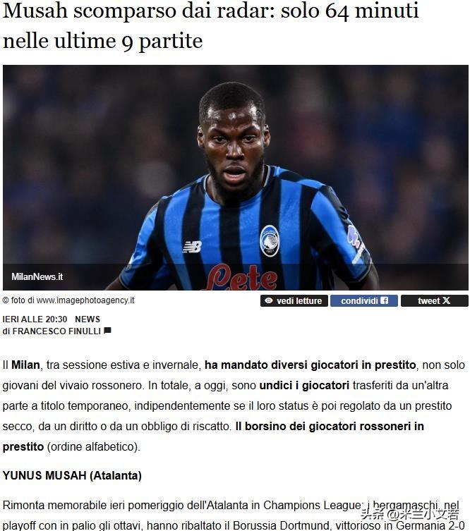穆萨!米兰租借亚特兰大的中场球员穆萨在最近九场比赛中只出场了六十四分钟。皮奥利我们就不说了,丰塞卡、孔塞桑与阿莱格里都带不动,亚特兰大的教练也带不动,多半是没救了,挺可惜的,穆萨这个身体素质哪怕有一点开窍也不至于混成现在这个结果。 穆萨是其中值得关注的一员。亚特兰大在欧回翻盘多特蒙德比赛中,全程在替补席上度过。这也是他近期境遇的缩影:在欧冠和意甲赛场,他已经连续4场比赛未能出场,在过去的9场比赛中总共仅上场64分钟。他上一次登场还是在2月9日,而上一次首发则要追溯到1月28日。 按说阿莱格里是欣赏穆萨这样的球员的,阿莱格里最擅长的就是在中场使用黑又硬,但穆萨貌似就没被阿莱格里认可,他的出租就是被阿莱格里放弃了,有消息说俱乐部希望冬季窗口收回穆萨,但阿莱格里拒绝了,当时很多老哥还说穆萨回来至少能给边翼卫和中场提供帮助,现在看恐怕穆萨是没啥机会了。