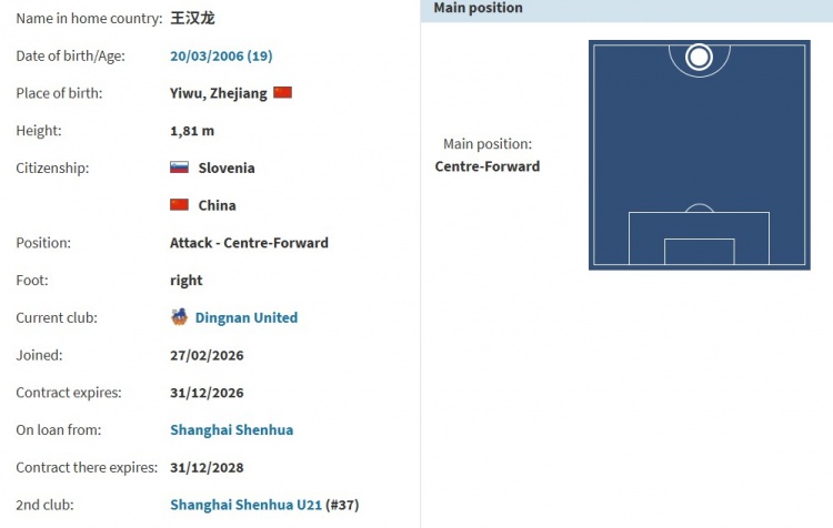 直播吧2月27日讯根据德国转会市场网站确认,19岁申花小将王汉龙已租借加盟定南赣联。