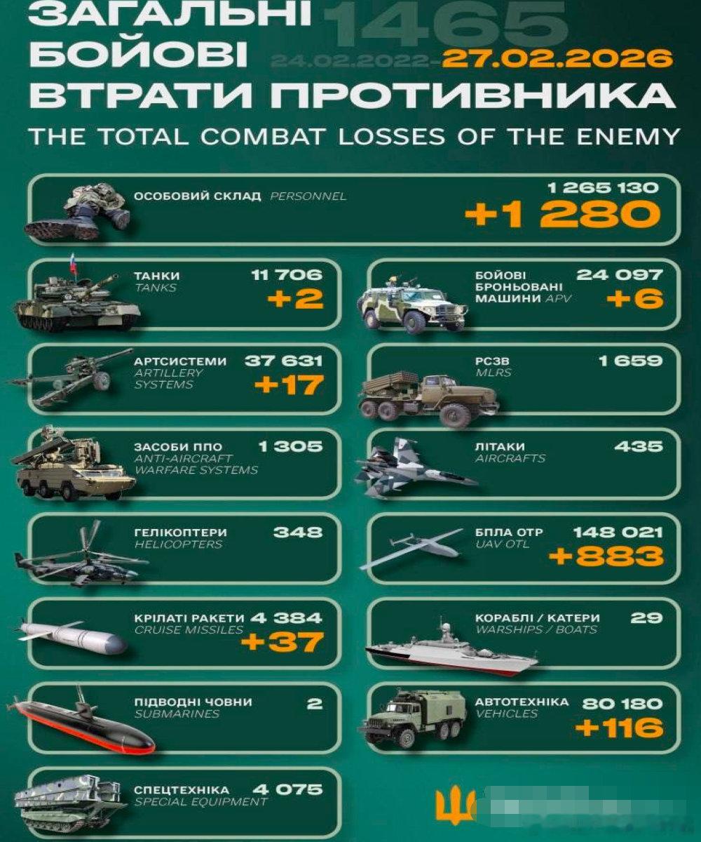 乌俄战争进入第1465天,乌克兰总参谋部发布战报:过去24小时乌俄双方交战102次,其中22次在胡利亚伊波列(17次在苏梅)、18次在托列茨克、9次在莱曼、29次在波克罗夫斯克、7次在南顿涅茨克区域。毙伤俄1280名。俄军累计损失1265130人。摧毁俄2辆坦克、6辆装甲车、17门火炮、883架大型无人机、116辆军车、37枚导弹。