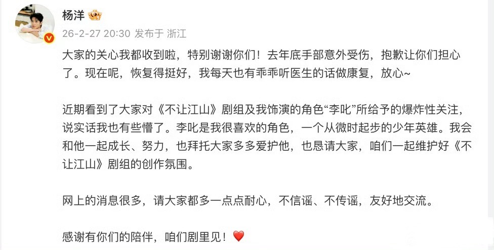 杨洋的手好肿,杨洋发文回应手肿了!
