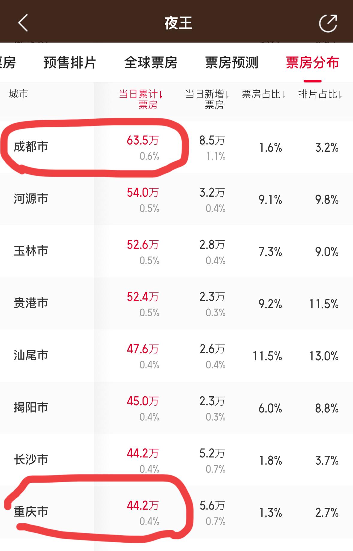 《夜王》上映8天,票房1.14亿,广州贡献了2903.7万,占比25.5%!有老广撑肯定没问题! 票房前10的城市中,有9个是广东省的,混进了上海,竟然超过了惠州,排到票房第9! 上海人也还港片吗?还是有很多广东过去的打工人?或者香港人? 平时叫得欢半个“粤语”地区的川渝,成都只贡献了63.5万的票房,重庆44.2万的票房,都很低呀