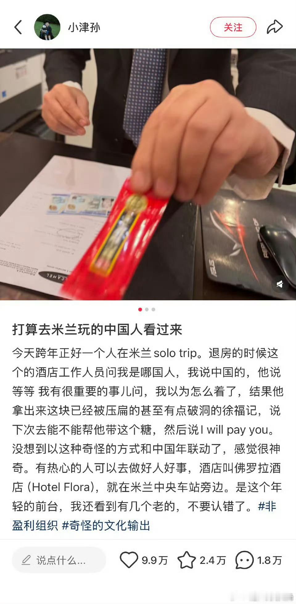 记得有部电影里写过:我们都是从这片陆地走向世界。 无论语言、无论肤色、无论信仰,此时人与人之间的交流被一颗小小的酥糖连在了一起,在两个不同国家之间,搭建起爱的桥梁退房的时候前台拿了个徐福记的糖纸