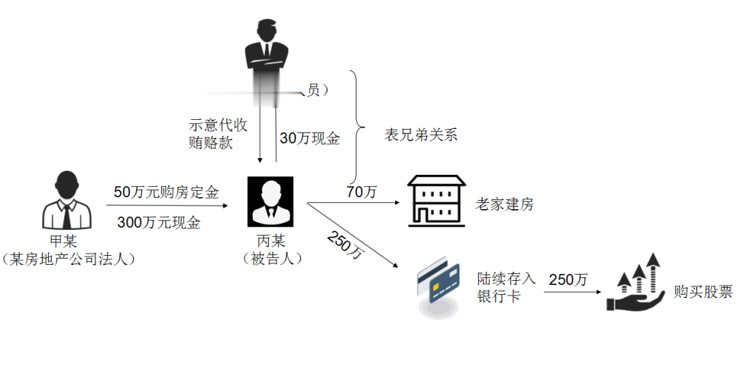 按照乙某要求,丙某将30万元现金交给乙某,70万元用于老家建房,250万元于2016年2月至4月陆续存入本人银行卡内。后又应乙某要求,丙某于2016年2月开立股票账户,陆续购入价值约250万元股票。