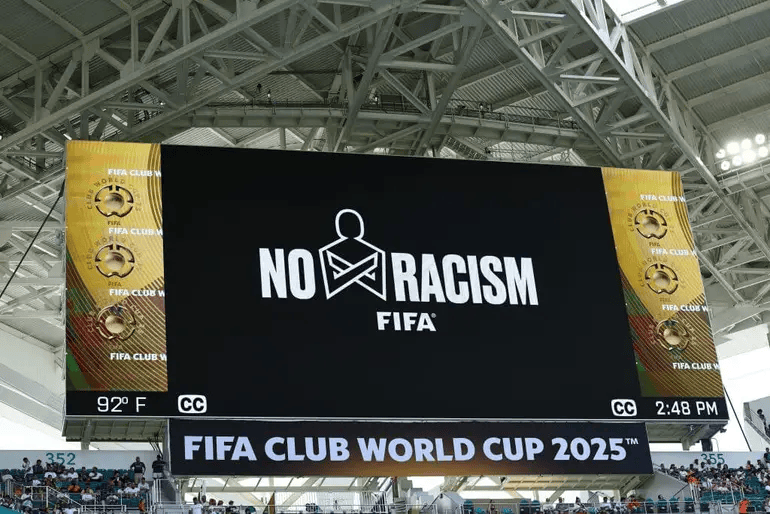 在2025年6月世俱杯首轮比赛结束后,TheAthletic披露,尽管国际足联在赛前制作了宣传材料,旨在推广其“反对种族歧视”和“反对歧视”的理念,但国际足联却撤下了场馆内的视频、标牌和营销素材。取而代之的是,国际足联使用了其目标较为模糊的“足球团结世界”宣传口号。