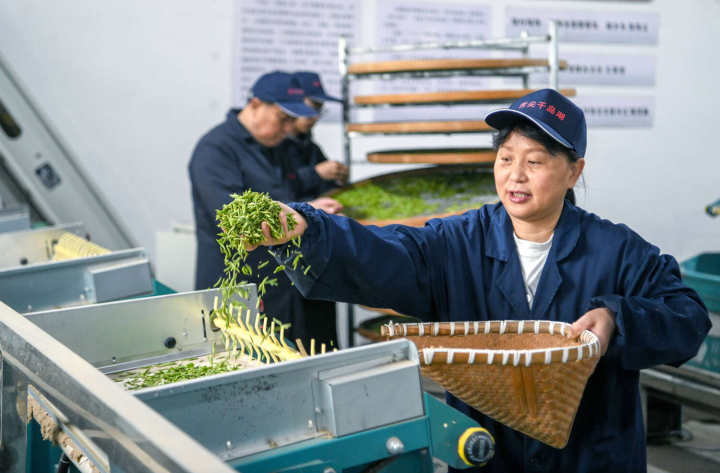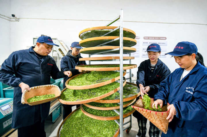 车间里,摊青、杀青、理条、烘干流水线有序运转,标准化加工让这缕湖山春香品质更稳。