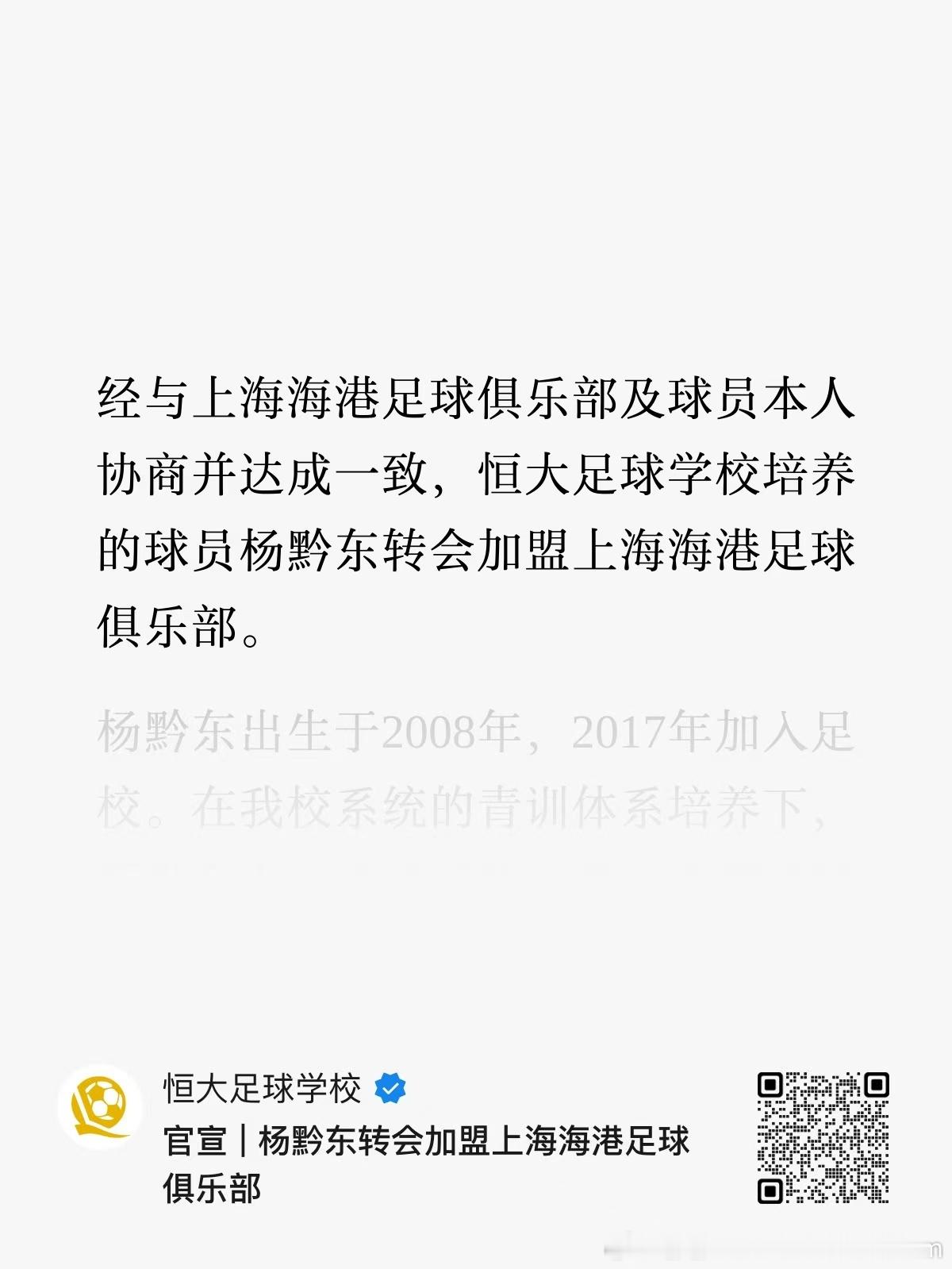 恒大足球学校培养的球员杨黔东转会加盟上海海港足球俱乐部。