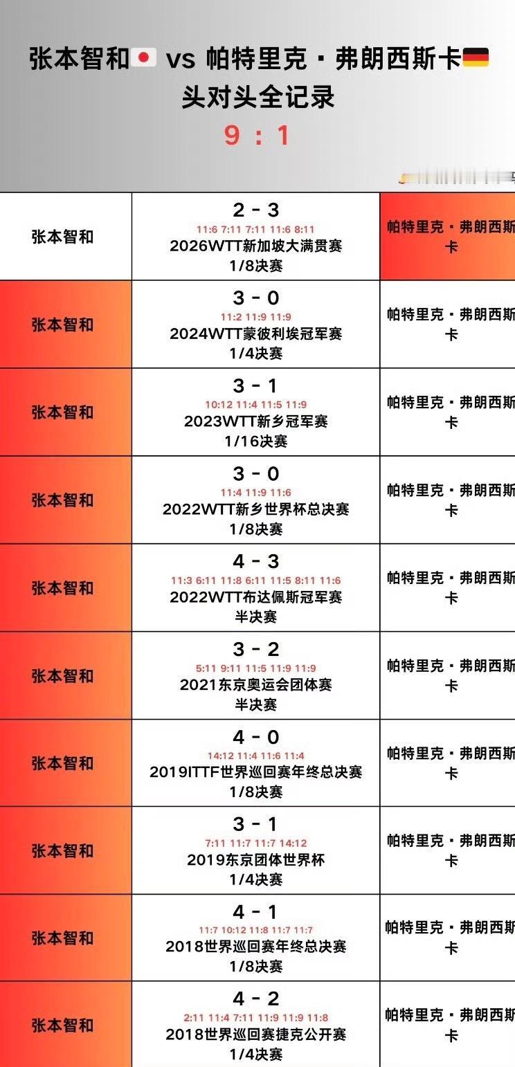 在2026年新加坡大满贯男单1/8决赛中,德国老将弗朗西斯卡以3比2逆转张本智和,终结此前9次交手的全败纪录