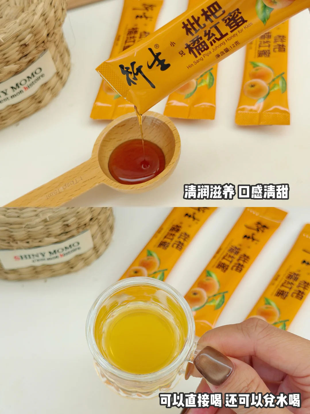 橘红蜜则是秋冬春三季的必备!这款质地是浓稠的蜜状,里面用了十多种草本🌿枇杷叶、龙眼肉、罗汉果、鱼腥草、玉竹等等,比一般的枇杷蜜专业很多,而且是淡淡的草本香,直接喝或者冲温水都可以,老大老二自己就能捧着喝,老三我会兑在奶里,一点不抗拒☺️