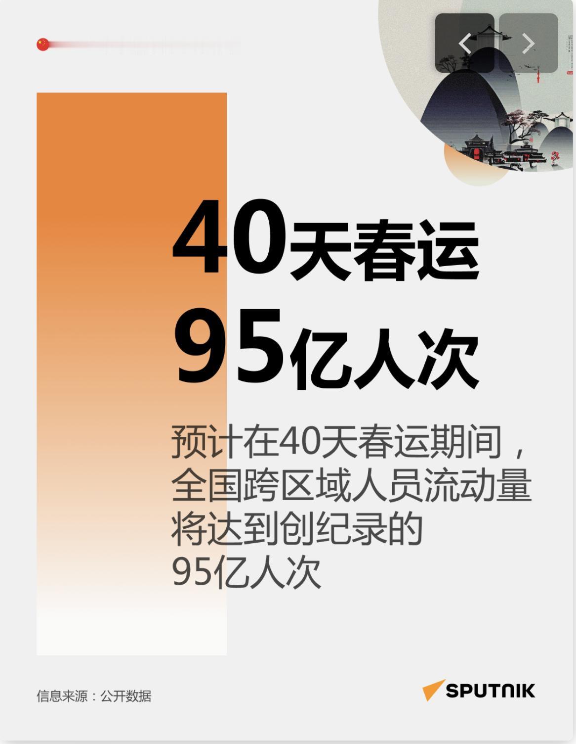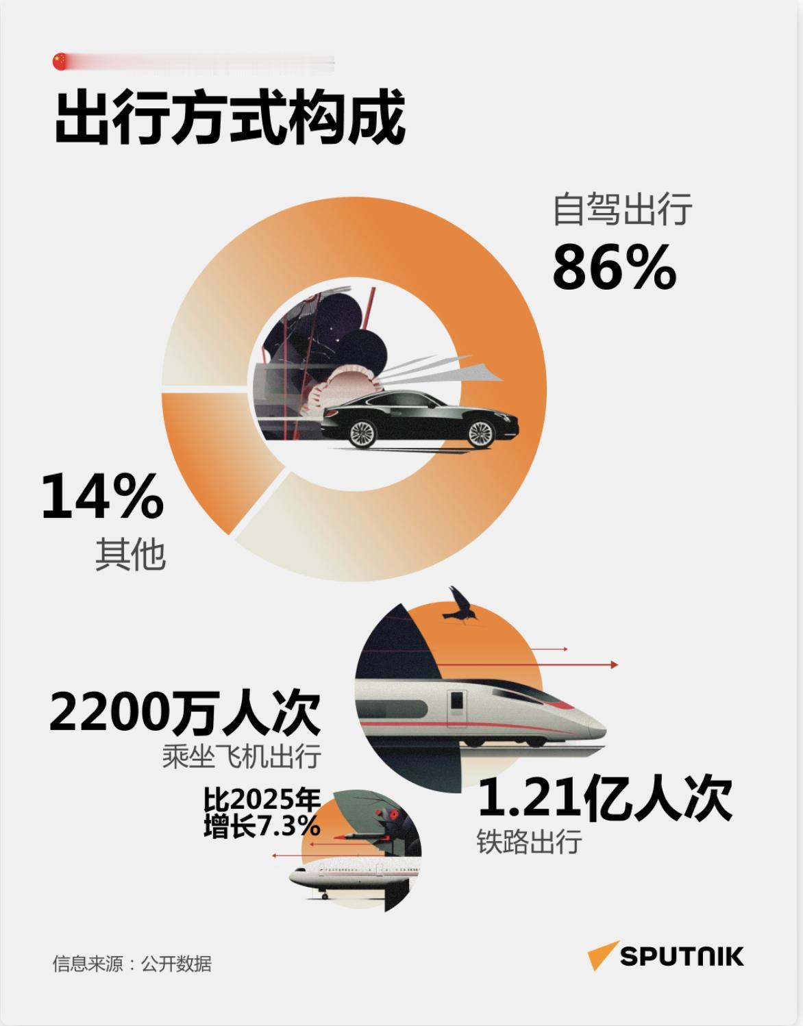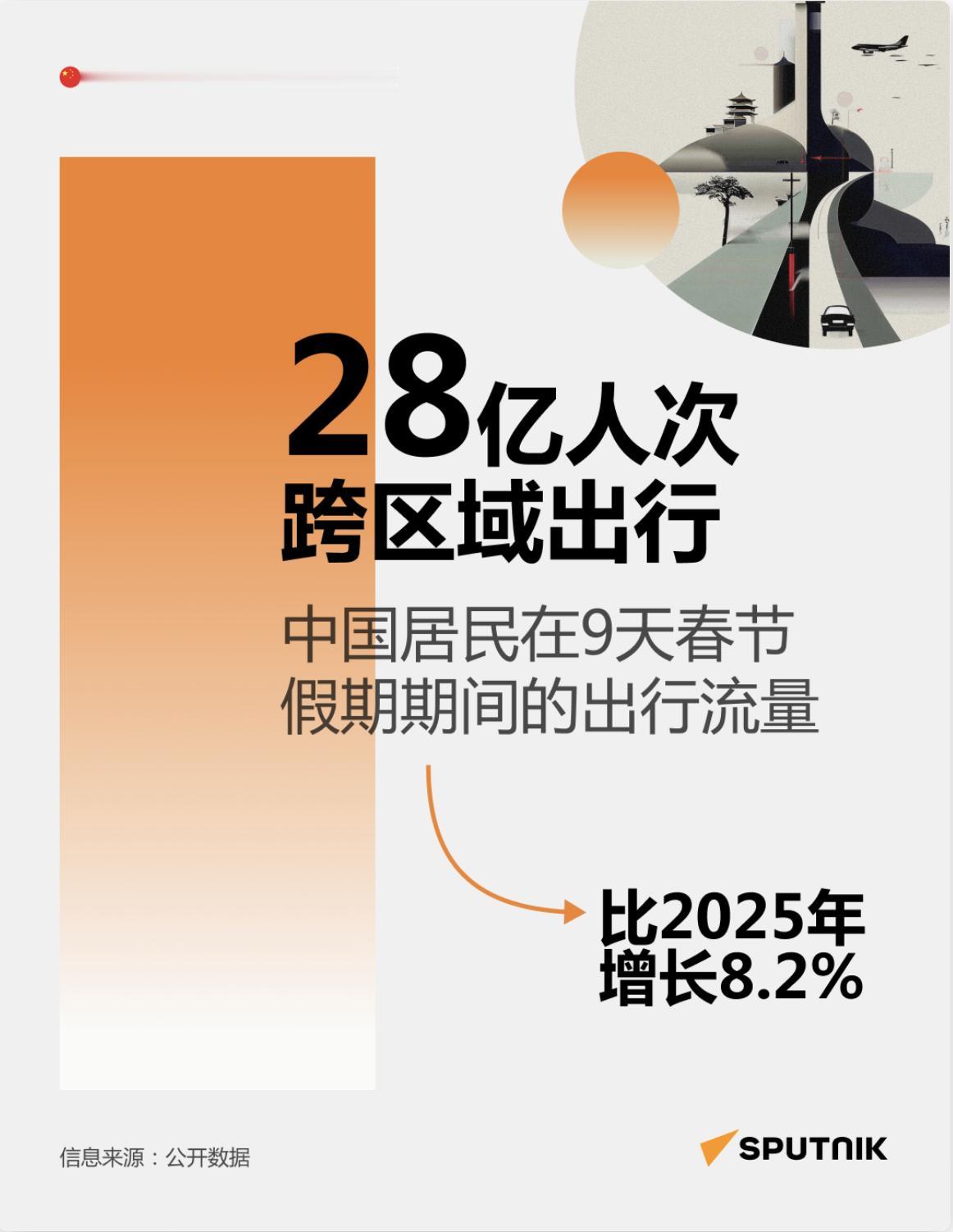 2026年春节假期中国出行数据 俄罗斯卫星通讯社 2026年2月27日, 20:03 (更新: 2026年2月27日, 20:16) 据中国文化和旅游部数据中心最新统计,今年春节9天假期,全国游客人数及旅游消费均创历史新高。这一数据充分展现了中国旅游市场的强劲复苏势头,也反映出人民群众旺盛的节日消费需求。俄罗斯卫星通讯社通过信息图表为您直观展现。