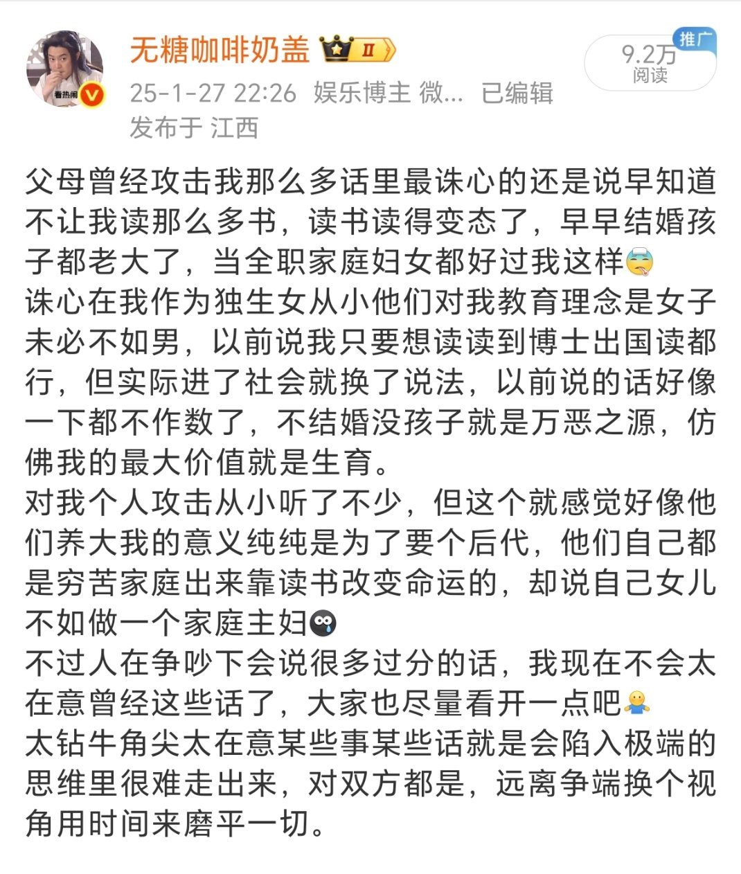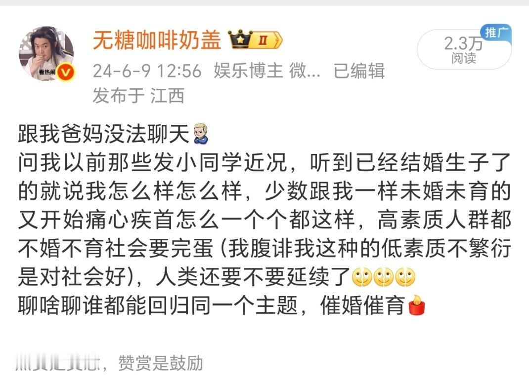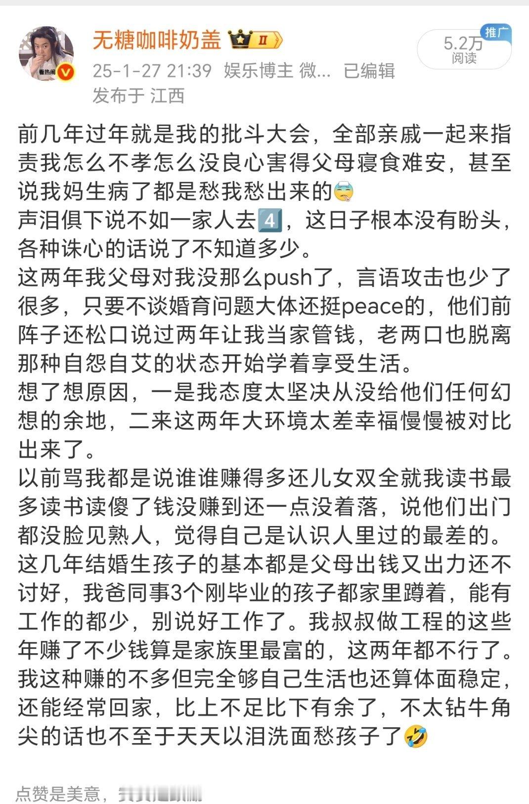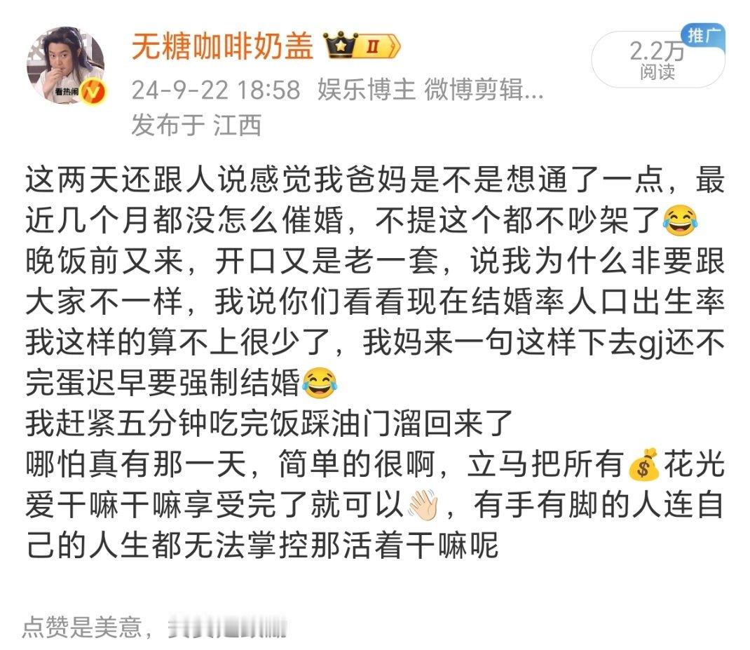 什么我读书读傻了,父母因为我出去抬不起头,我妈身体不好都是被我气的,各种难听话都说过了,我微博也发过不少被催婚的相关吐槽。但让我滚出家把他们给的都吐出来这种话也说过不少但从来没有实际行动,我去年搬的新家还是他们全款买给我的,从这点就看出来他们催婚起码不是单纯为了自己面子更多是想让我有个世俗意义上比较稳定幸福的生活