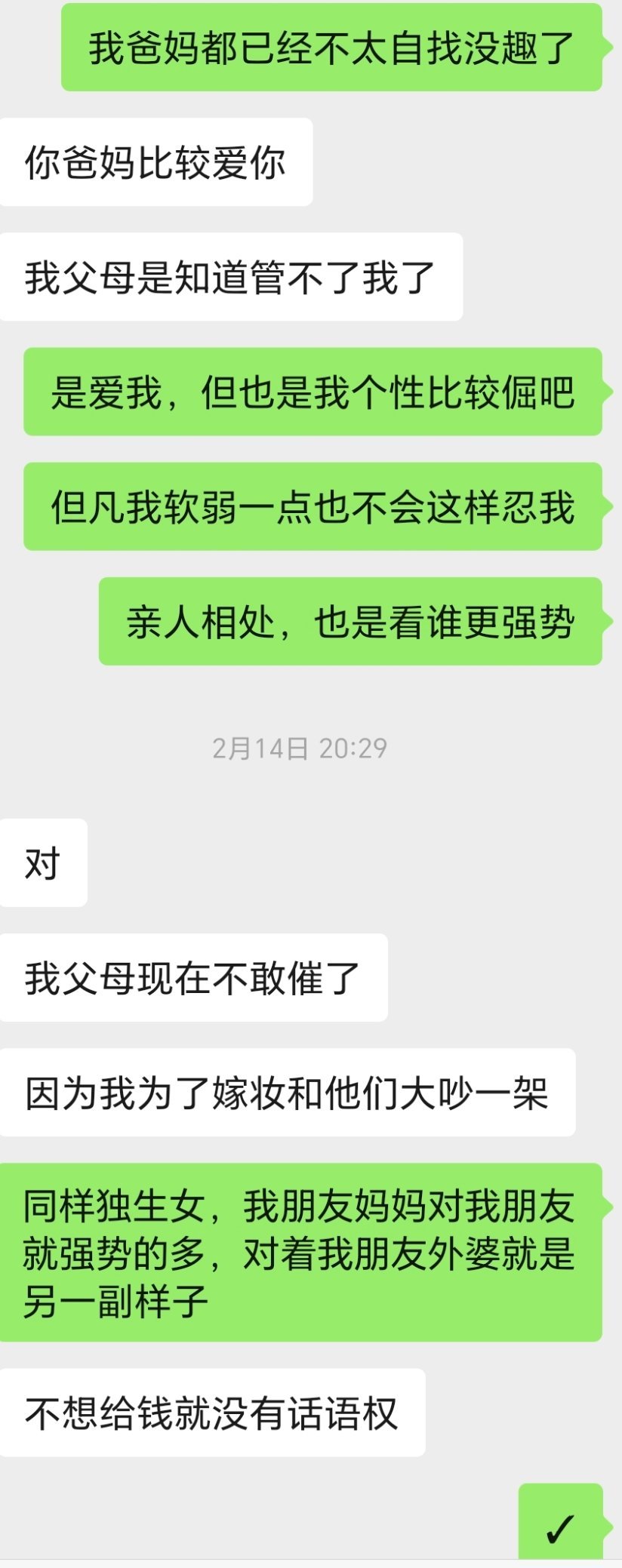 这次过年在家十天他们只忍不住提了一次结婚生子的事,说我一直这样同事领导会把我当异类欺负我,老了住养老院护工也会欺负我两个人说了不到十分钟我一直没接茬进了房间,回头他们还来好声好气喊我吃饭