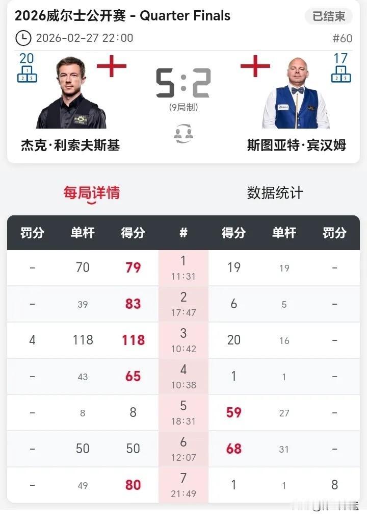 🎱威尔士公开赛已🔚的两场1/4决赛,“萝卜丝”尼尔·罗伯逊、“二师兄”宾汉姆都止步八强啦。霍金斯5 - 3击败尼尔·罗伯逊率先晋级半决赛,利索夫斯基也以5 - 2战胜宾汉姆挺进4强。 斯诺克逆转 斯诺克大冷门