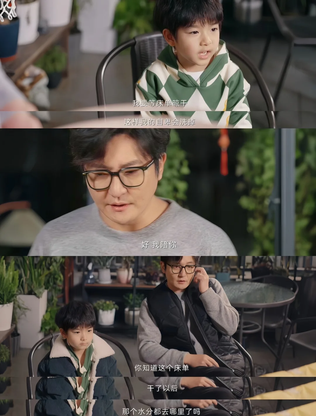 ✅而他们男主内女主外,在我看来只要适合男孩成长就是蕞好的,在这里我挺爸爸,有了他的陪伴,让孩子终于肯一个人入睡,不再需要大人守着他睡着才离开;更通过陪孩子晾床单(孩子尿床)的这个小日常,延伸到培养孩子物理知识和想象力方向;立下规矩,就一定要执行到底,爸爸比妈妈和姥姥“狠心”多了。