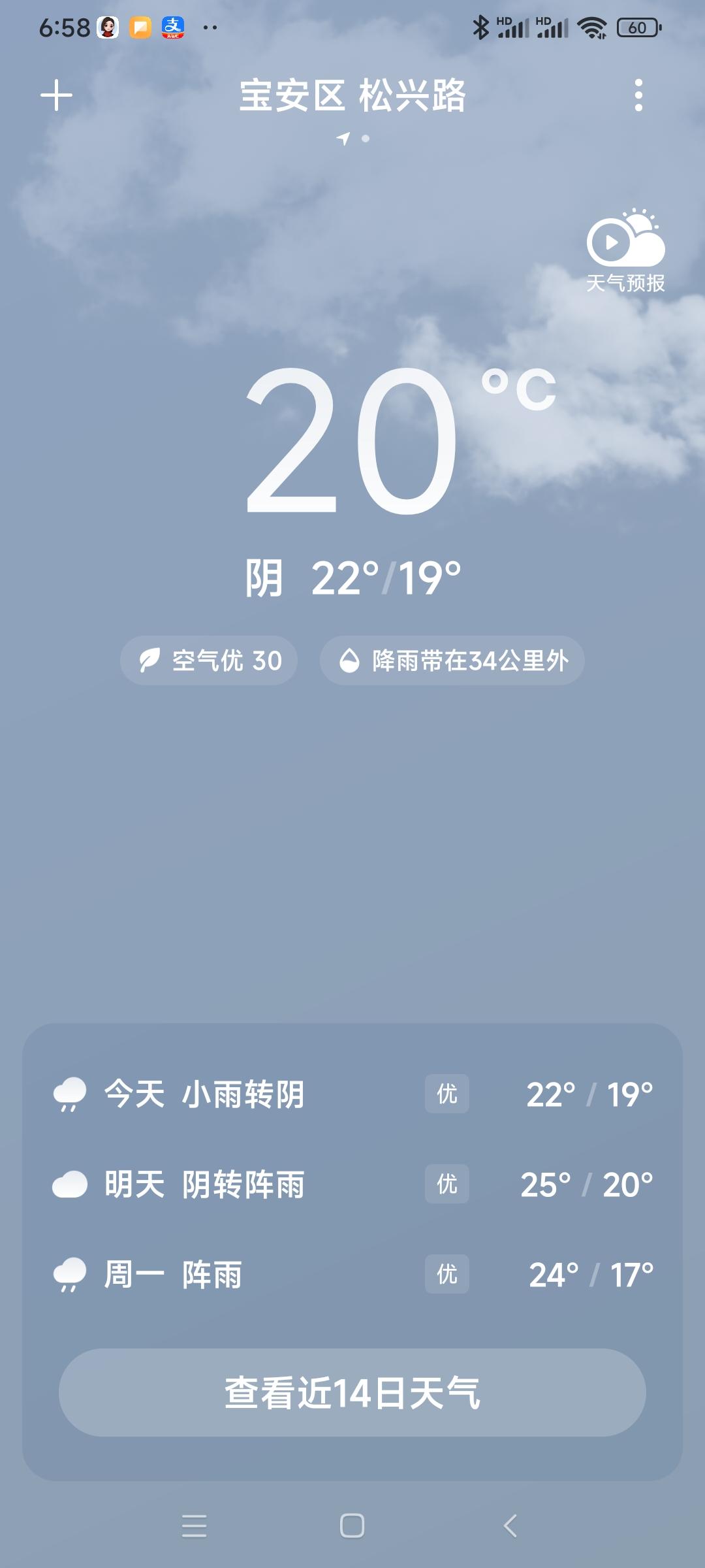 我的今日状态:😁轻松愉快 我这里的天气:🌤️多云分享深圳天气,深圳今日小雨转