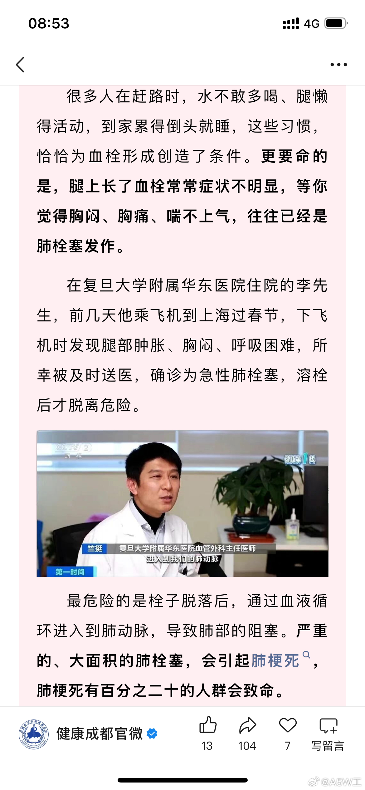 说了长期久坐,比如长时间坐火车、汽车、长时间用电脑、玩游戏等等都可能导致血栓形成从而导致心脏问题等等。