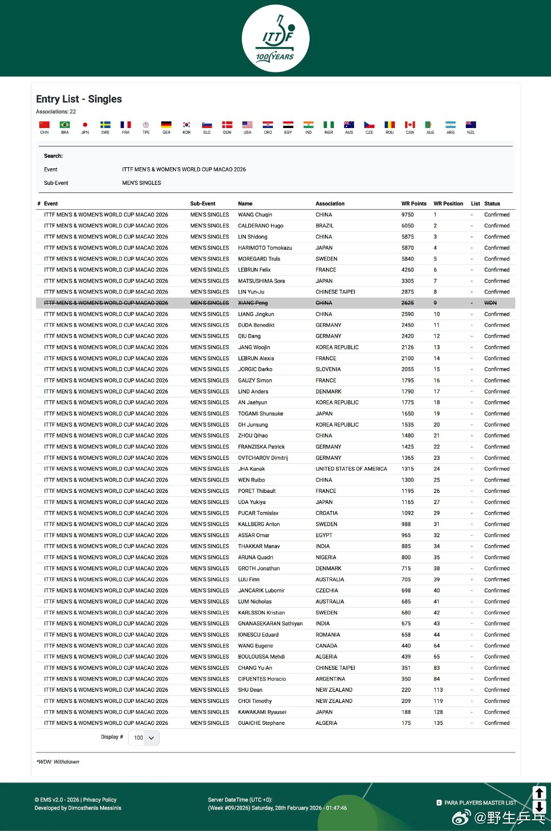 🏓️根据国际乒联官网显示的报名名单,2026澳门世界杯中国队参赛名单如下:男单:王楚钦、林诗栋、梁靖崑、周启豪、温瑞博女单:孙颖莎、王曼昱、陈幸同、蒯曼、王艺迪、覃予萱