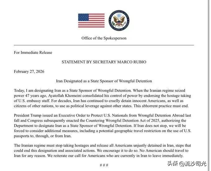 国务卿卢比奥发表声明,宣布将伊朗列为"非法拘押国家赞助者"。 国务卿马尔科·鲁比奥声明2026年2月27日——伊朗被指定为错误拘留的国家赞助者今日,我宣布伊朗为“非法拘禁行为”的支持国。当伊朗政权于47年前夺取政权时,阿亚图拉•霍梅尼通过支持扣押美国大使馆工作人员作为人质,巩固了对权力的掌控。数十年来,伊朗一直持续残酷拘禁无辜的美国人以及其他国家的公民,并将其用作针对其他国家的政治筹码。这一令人憎恶的行径必须终止。特朗普总统发布了一项行政命令以保护美国。去年秋天,国会随后通过了2025年《反非法拘留法案》,授权国防部指定伊朗为非法拘留的国家赞助国。如果伊朗不停止,我们将被迫考虑额外措施,包括可能对美国护照的地理旅行限制,禁止其前往、通过或从伊朗出发。伊朗政权必须停止劫持人质的行为,并释放所有在伊朗境内被不公正拘押的美国人。这些举措有望终止这一定性以及与之相关的行动。我们鼓励伊朗采取此类行动。任何美国人都不应出于任何原因前往伊朗。我们再次呼吁目前在伊朗境内的美国人立即离开。伊朗