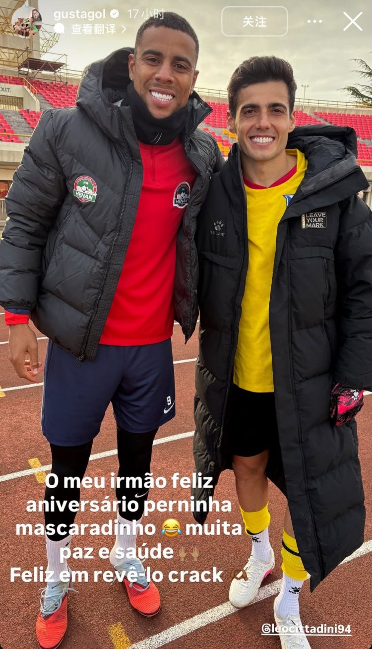 赛后河南队外援古斯塔沃更新社媒,晒出和宁波队外援奇塔迪尼的合影,两人曾在上海海港当过队友,昨天也是奇塔迪尼32岁生日。